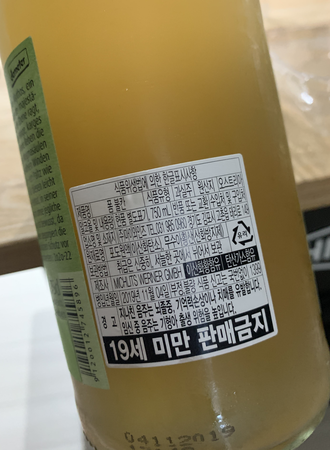 내추럴 와인이지만 라벨에 아산화황 함유와 탄산가스함유라는 말이 적혀있다. 아산화황을 극소량 넣었거나 혹은, 자연발효에 의해 생긴 것이라고 해도 라벨에 적지 않으면 한국 식약청에서 전량 폐기를 요청하기 때문이라고 한다.