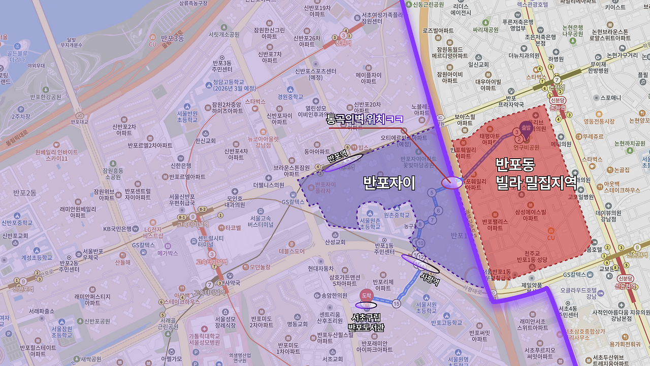 이 빌라촌에서 주민센터나 도서관을 가려면 반드시 아파트 밀집 지역으로 넘어가야 한다. 가파른 언덕과 오르막이 반복되는 빌라촌을 벗어나, 반포자이로 향하는 작은 굴다리를 통과해야 비로소 평지가 나타난다.