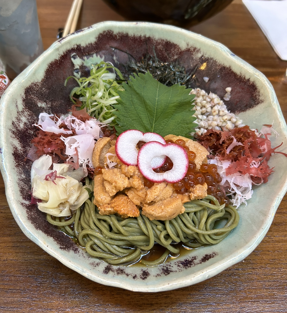 말차 매밀면과 우니, 미역, 생강, 연어알, 오쿠라, 시소, 얌, 와사비, 파 그리고 다시.
