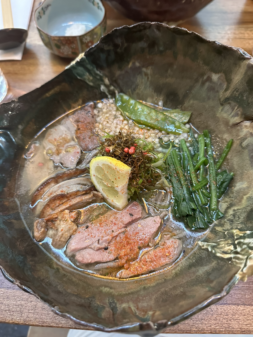 중식과 일식이 한 접시 위에 그려진 따뜻한 오리 시호 소바이다.
