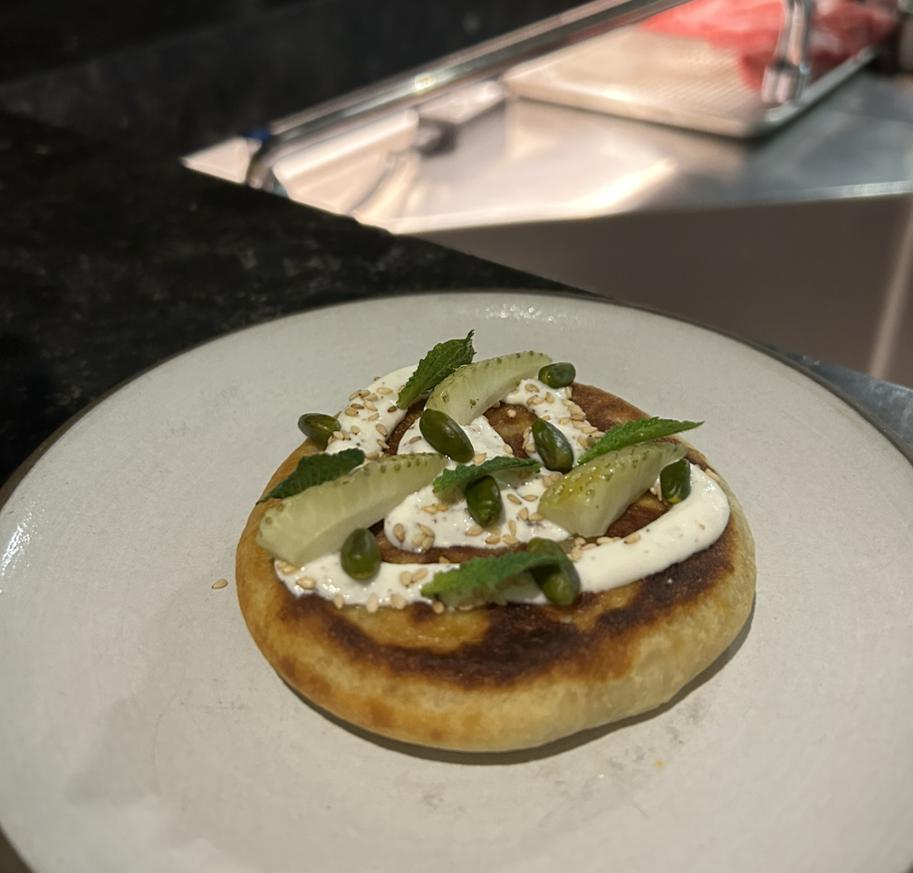플렛 브레드의 토핑을 보면 직접 발효한 요거트, 민트, 시실리안 피스타치오, 깨, 그리고 피클링 한 딸기가 올라가 있다.