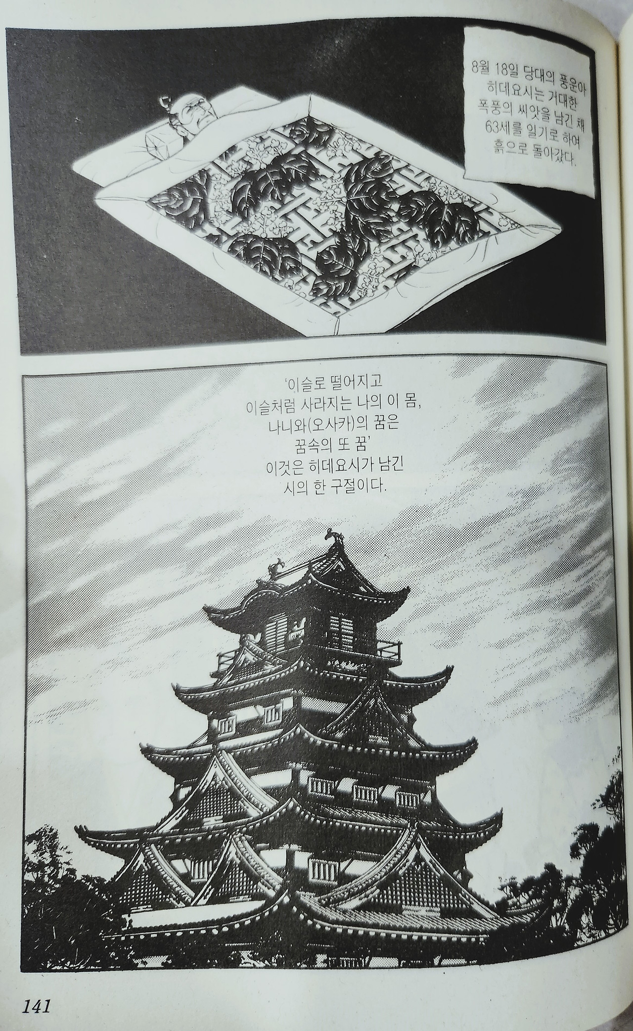 평생 그 총명함과 실력으로 삶을 일궈온 히데요시가, 그와 그 아들에게 들이닥칠 미래를 정확히 내다보았기 때문일까? 이런 마지막 순간에 그가 남긴 절명시는 이렇다.