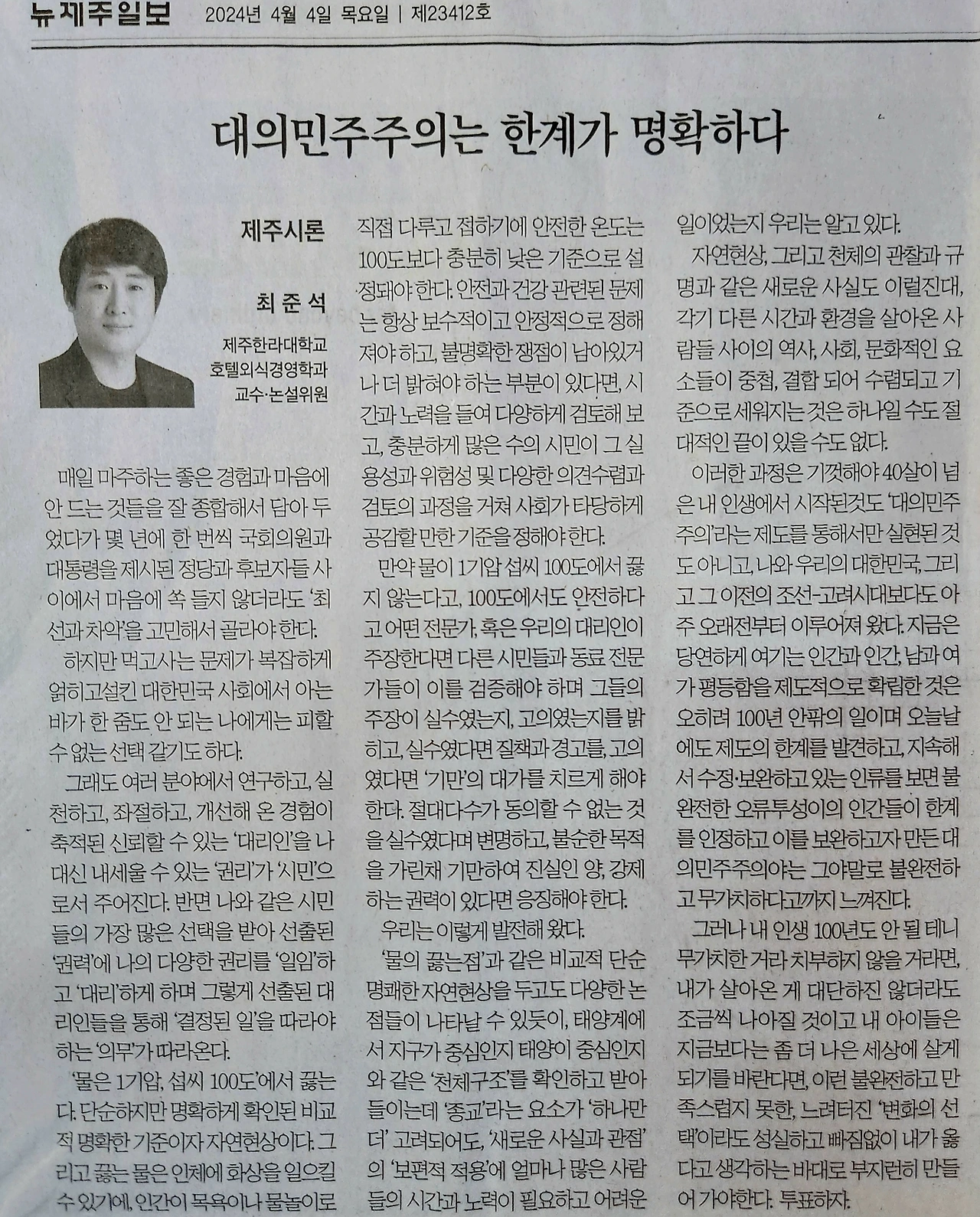 매일 마주하는 좋은 경험과 마음에 안 드는 것들을 잘 종합해서 담아 두었다가 몇 년에 한 번씩 국회의원과 대통령을 제시된 정당과 후보자들 사이에서 마음에 쏙 들지 않더라도 ‘최선과 차악’을 고민해서 골라야 한다.