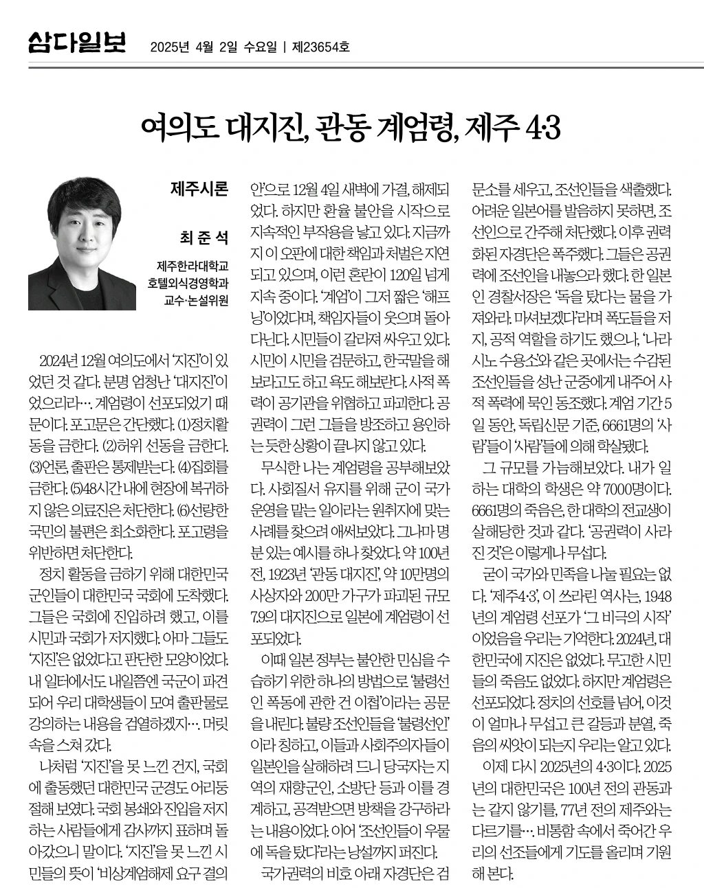 2024년, 대한민국에 지진은 없었다. 무고한 시민들의 죽음도 없었다. 하지만 계엄령은 선포되었다. 정치의 선호를 넘어, 이것이 얼마나 무섭고 큰 갈등과 분열, 죽음의 씨앗이 되는지 우리는 알고 있다.