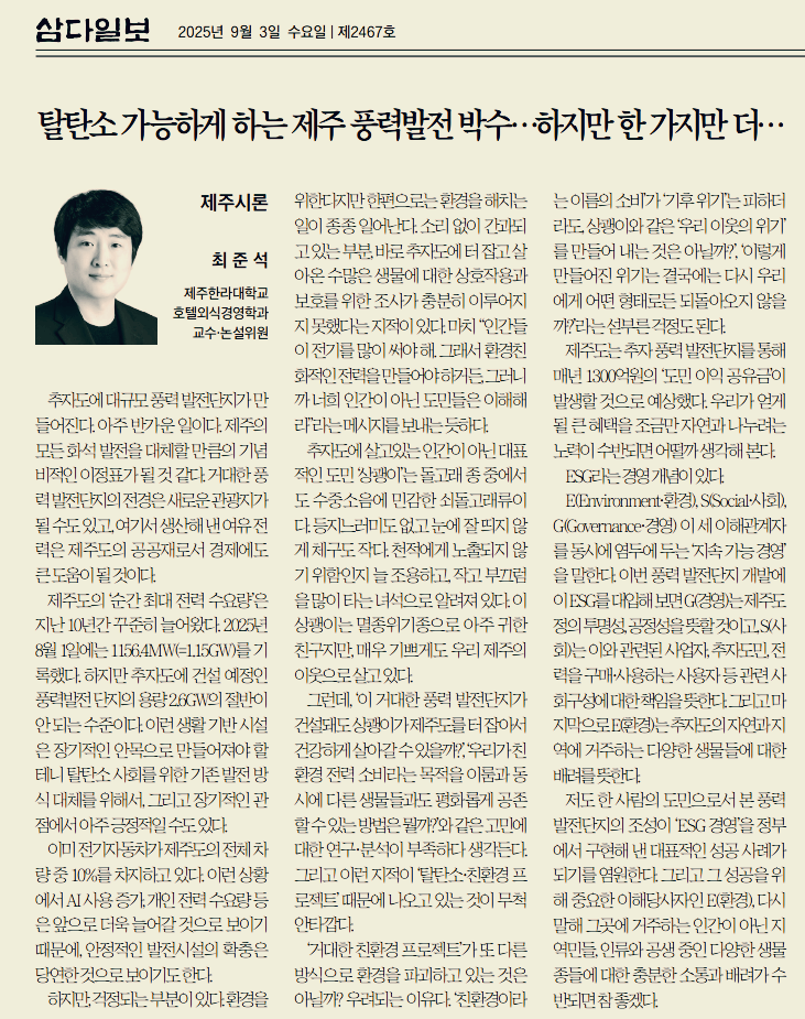저도 한 사람의 도민으로서 본 풍력 발전단지의 조성이 ‘ESG 경영’을 정부에서 구현해 낸, 대표적인 성공 사례가 되기를 염원합니다. 그리고 그 성공을 위해, 중요한 이해당사자인 E(환경), 다시 말해 그곳에 거주하는 인간이 아닌 지역민들, 인류와 공생 중인 다양한 생물종들에 대한 충분한 소통과 배려가 수반되면 참 좋겠습니다.