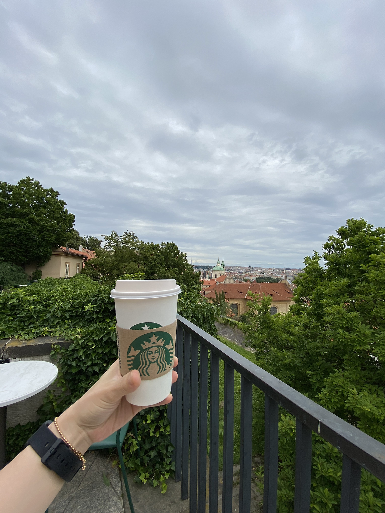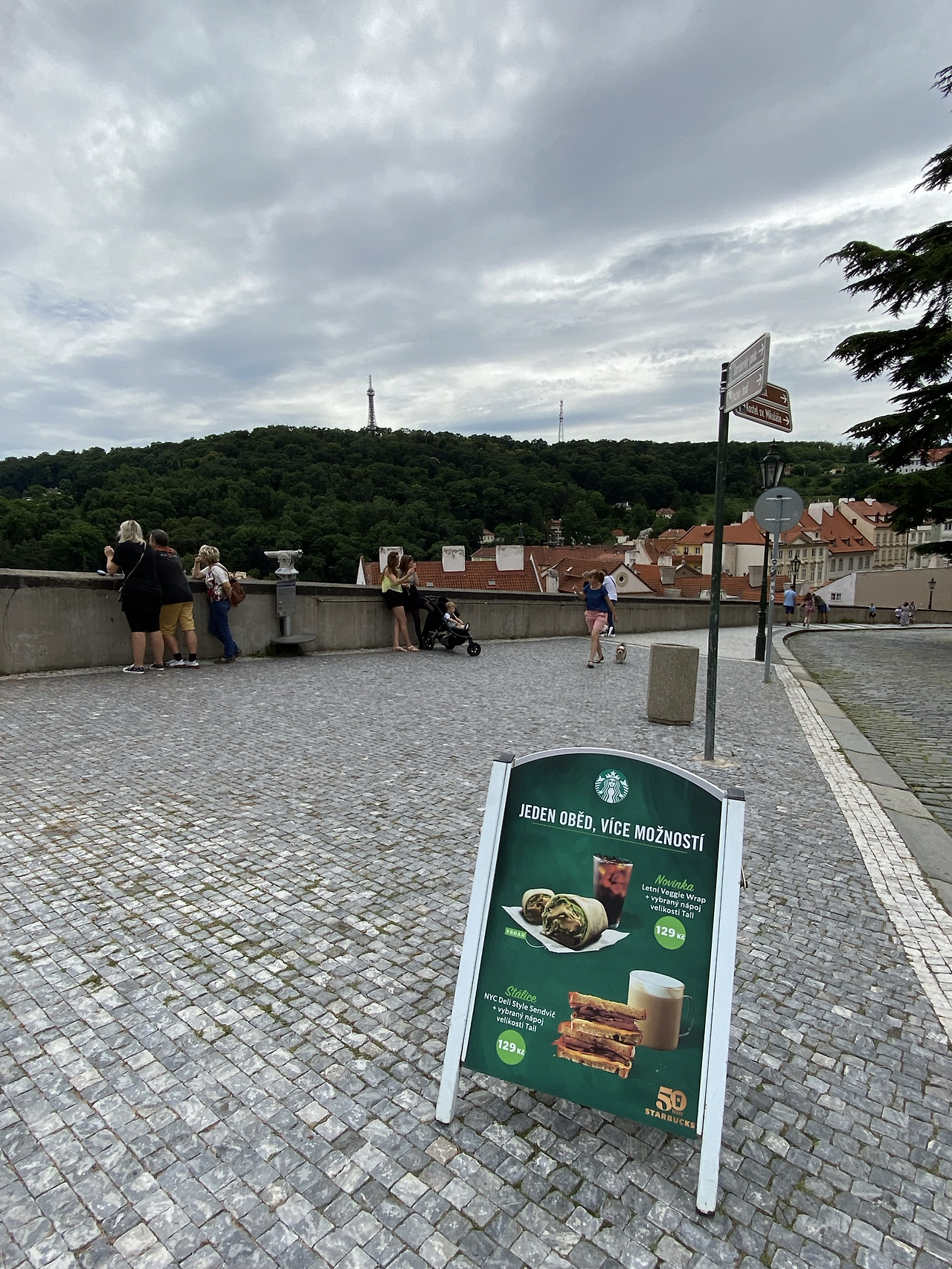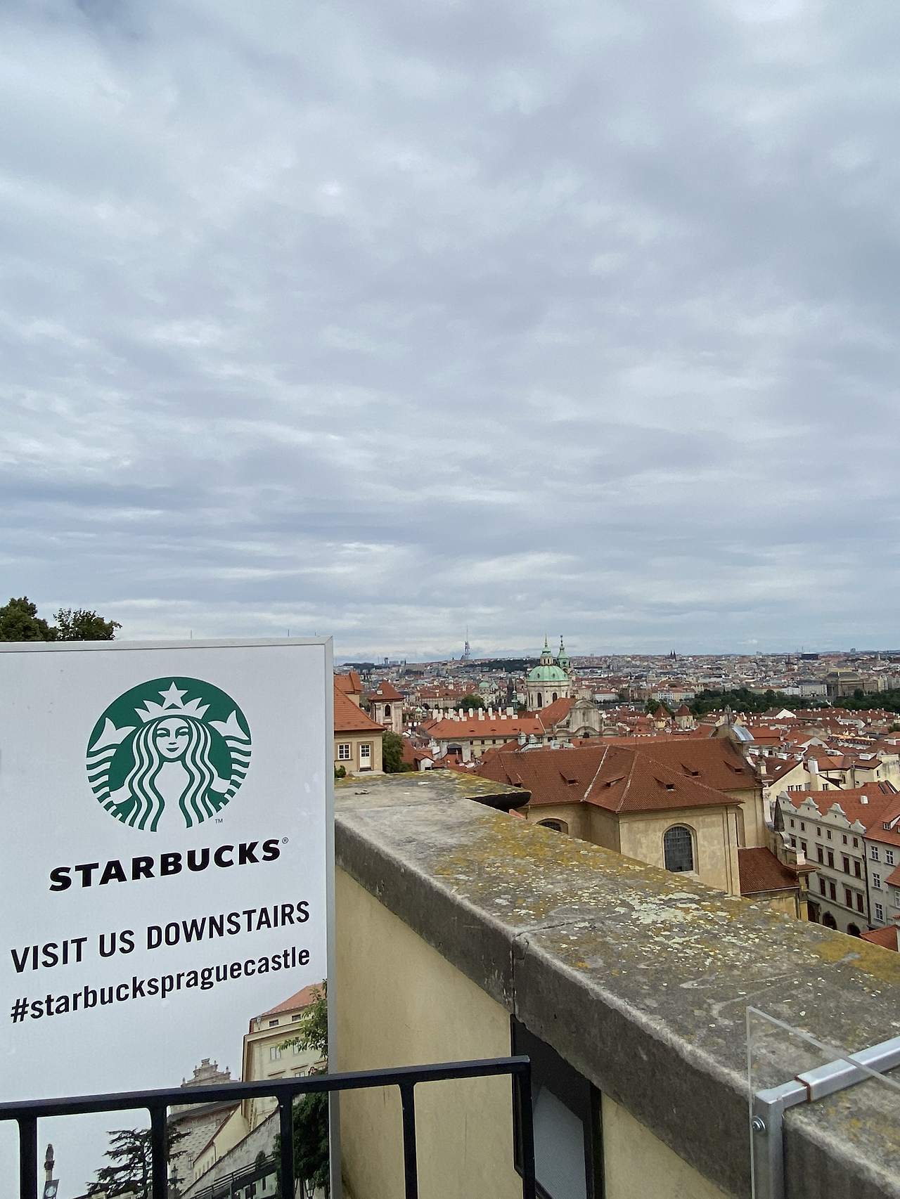 프라하에는 11세기부터 18세기 사이에 건축된 유럽 양식의 건축물이 다양하게 남아있다. 영화에서나 봄직한 고풍스런 건축물을 실제로 볼 수 있다는 것만으로도 큰 기쁨이다. 그런 점에서 유럽여행 경험이 없는 부모님께는 꽤 이국적인 시간이 될 것 같다. 프라하 성은 체코의 대표적인 관광 코스다. 이 나라를 대표하는 국가적 상징물이자 유럽 전체에서 손꼽히는 거대한 성이다. 9세기 말부터 짓기 시작해 18세기에 이르러서야 지금과 비슷한 모습을 갖추었다고 한다. 구시가지의 블타바강 맞은편 언덕에 자리 잡고 있는 프라하 성. 그 위를 거닐다가 눈에 익은 간판을 발견했다. 18세기 성 위에 21세기 카페라니 피식 웃음이 새어 나온다.