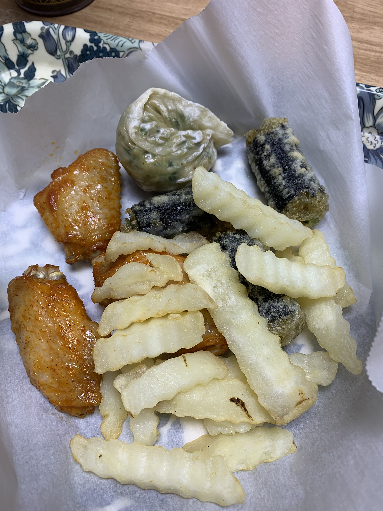 에어 프라이기를 열고 종이 포일을 깔고 만두, 버펄로 윙, 김말이, 감자튀김을 적절히 섞어서 바닥에