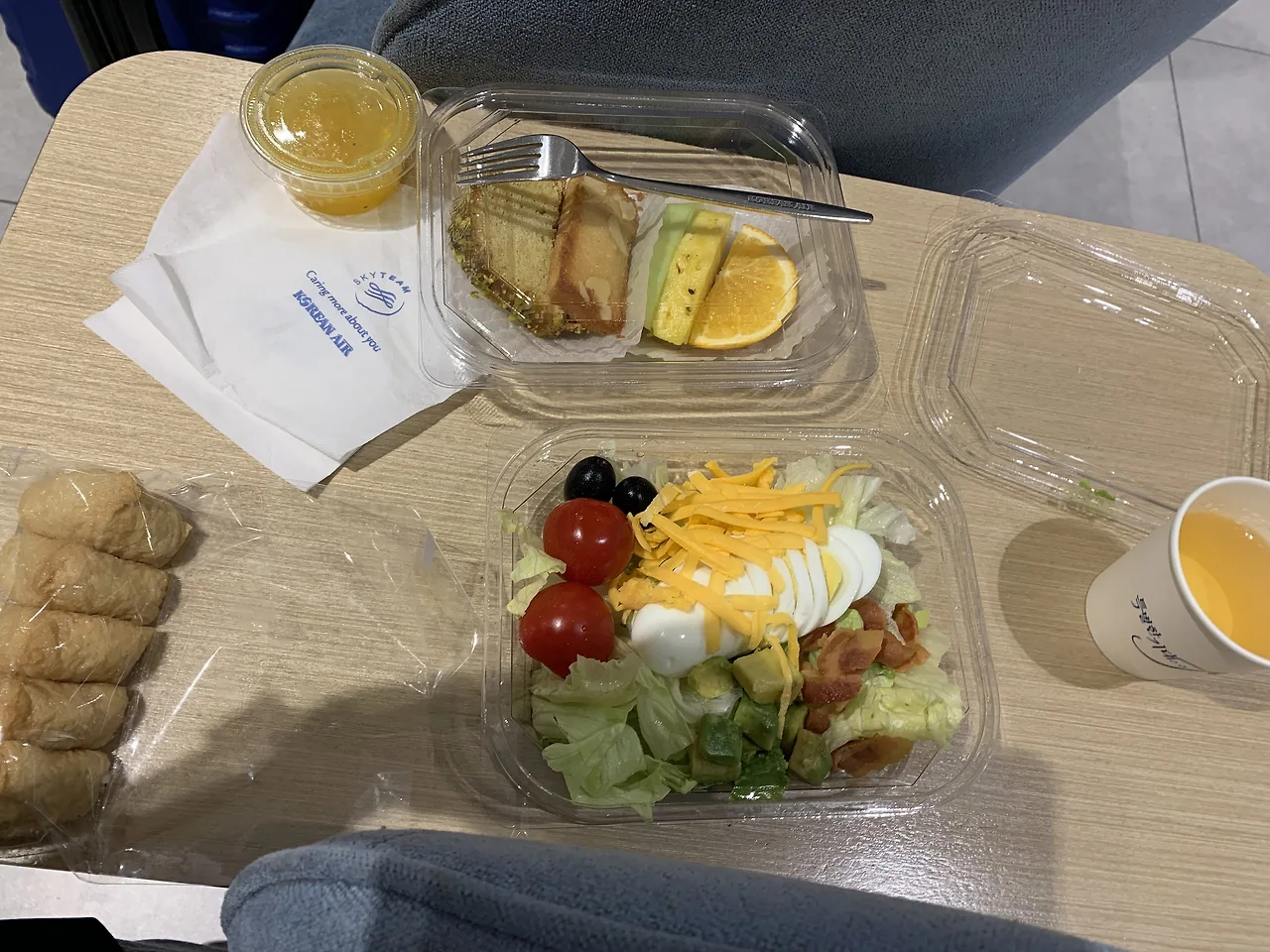늦은 시간에 도착한 인천공항이지만 (밤 10시경) 아무리 그 시간을 감안한다고 해도 너무 한산하다. 직원이 더 많은 듯한 느낌이 들며, 10분도 안 걸리며 이미그레이션을 통과한다. 너무도 다행히 라운지를 쓸 수 있어 비행기 출발까지 뭐라도 먹으러 라운지에 들어간다. 어느 뷔페 부럽지 않던 라운지였는데 샐러드, 맥주, 유부초밥과 컵라면이 전부. 물론 사람도 거의 없다. 서울역에서부터 같이 타고 온 승객과도 마주친다. 뭐 어디 멀리 갈 데도 없지 않은가? 같은 비행기라는데 ㅋㅋ