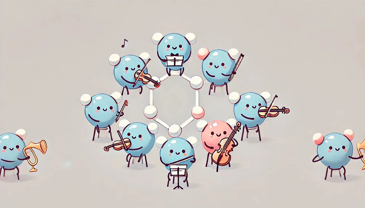 ChatGPT 에게 오케스트라 단원이 된 원자들을 귀엽게! 그려보라고 했더니 만들어낸 이미지. 귀여운지 잘 모르겠다...