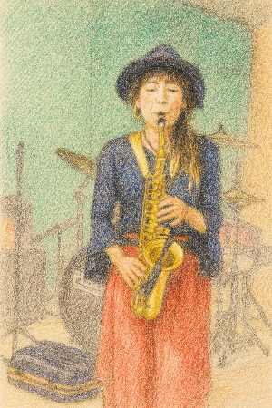 하늘하늘한 빨간 스커트바지에 반짝이는 검은 티셔츠, 검은 중절모 차림으로 그만의 작은 무대를 만들었다. 색소폰과 피아노 연주, 감성 깊은 노래를 하나하나 선물하듯 들려주었다.