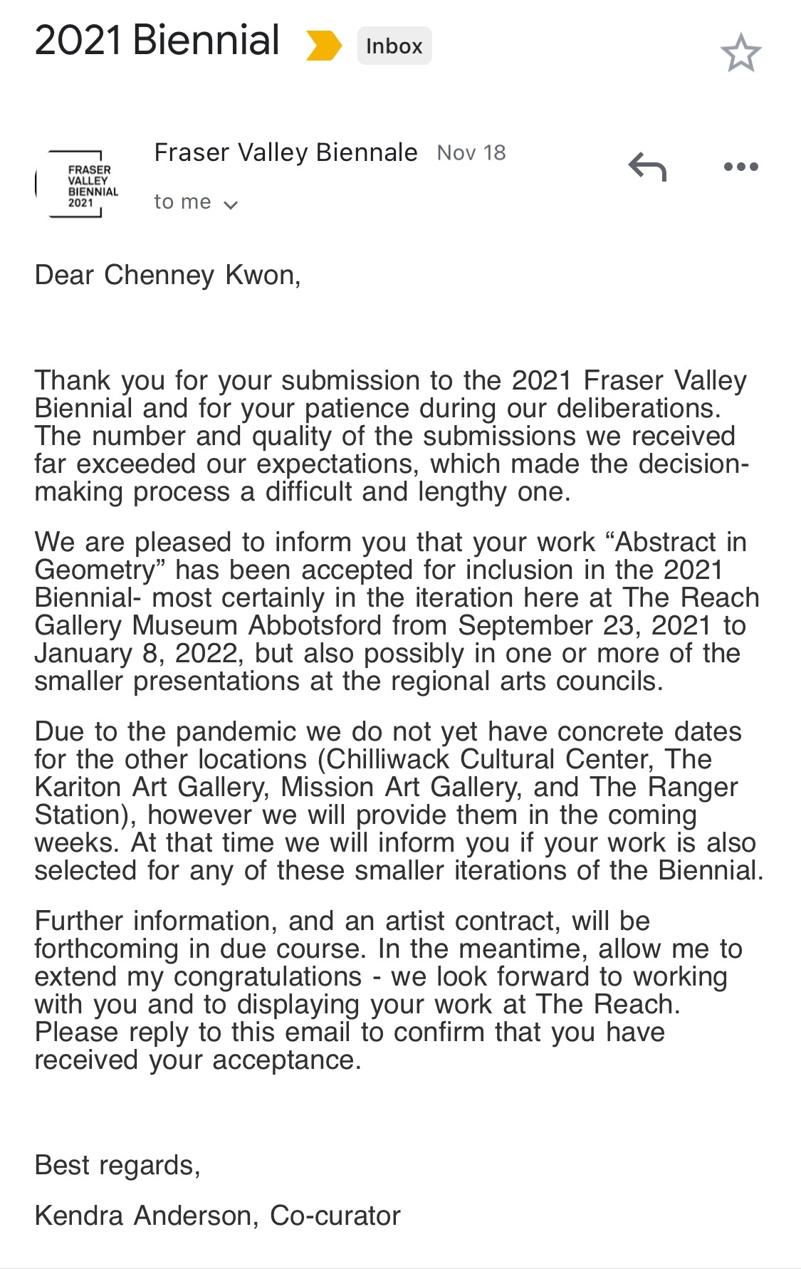 덕분에 그의 미술관이 2년마다 주관하는 Fraser Valley Biennale라는 행사 참가를 권유받았다.
