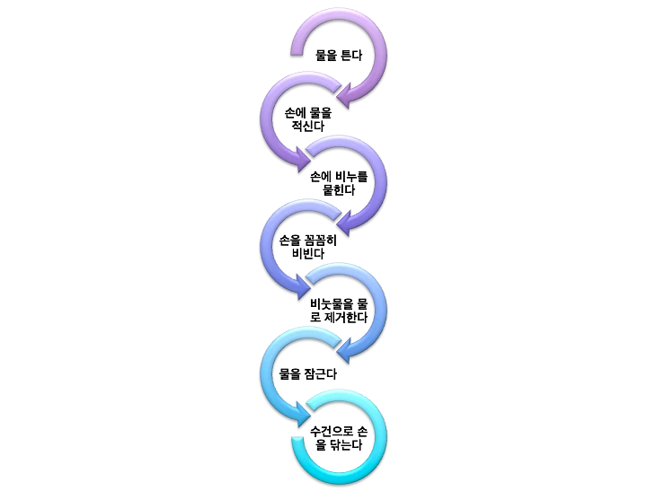 먼저는 손 씻기 과정의 순서를 하나하나 분리해서 가르친다.
