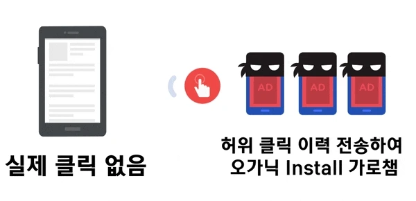 클릭 인젝션이란 디바이스의 기존 앱 내에 숨겨진 Malware나 Bot이 오가닉 유저가 앱을 다운로드하고 오픈하는 사이의 구간 동안 가짜 클릭을 발생하여 Install attribution을 훔치는 방식을 말합니다. 최근에는 구글에서 실제 설치 완료 시간을 주기 때문에 첫 실행 사이에 발생하는 클릭(인젝션 클릭)을 대부분의 트래커에서 필터링하고 있습니다.