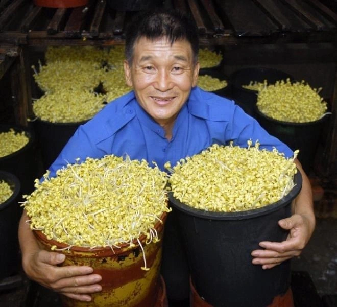 햇볕을 보고 자라는 콩나물은 우리가 아는데로 광합성을 하기 때문에 초록색으로 자란다.. 영양은 더 좋지만 질겨서 씹는 맛이 별로라 우리가 익숙한 노란색 콩나물을 키우고 판매한다..