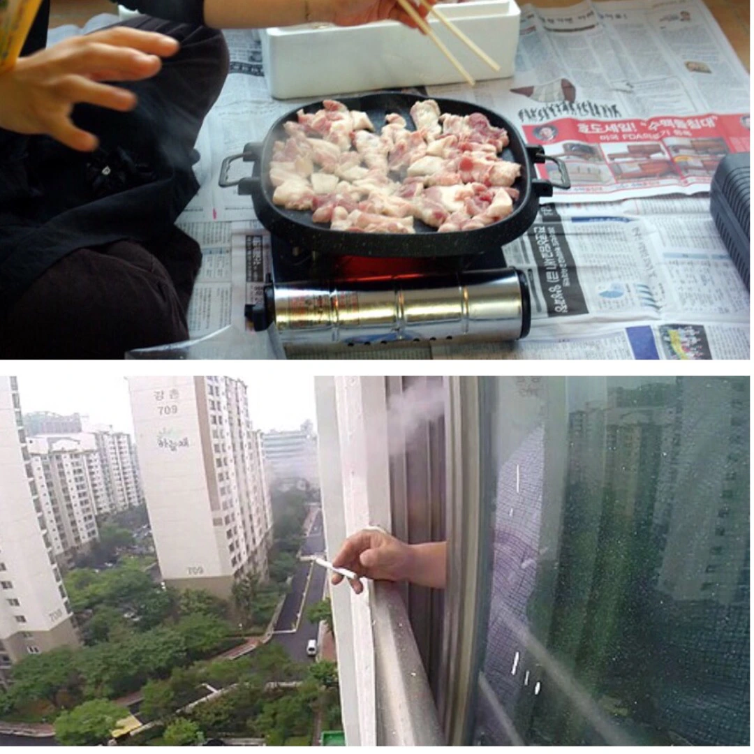 누가 배려심없이 냄새나게 고기를 구워 먹는거야!