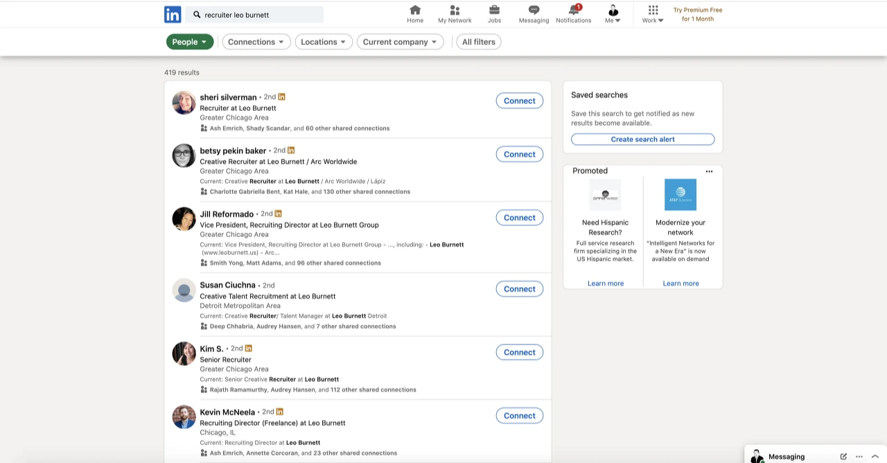 링크드 인에 들어간다. 관심 있는 광고대행사와 함께 Recruiter 혹은 Creative Recruiter를 덧붙여서 검색한다. 프로필이 등장할 것이다. 제작의 경우에는 Creative Recruiter에게 포트폴리오를 보내야 한다. 보통 큰 회사 기준으로 2 -3명 정도의 리쿠르터가 있다. 이름을 알아냈다면 반은 성공한 것이다.