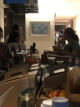 난 목이 마르지도 않은데 물 한 잔을 찾으며 키친 바에 삼삼오오 모여 대화를 나누고 계시는 유키 님과 엘라 님 그룹에 자연스레 껴본다. 여기서도 나의 단골 질문 "What's your history?"로 흥미로운 대화를 이끌어간다.