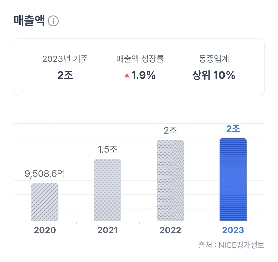 일단 매출은 2023년 기준 2조 원, 전년 대비 소폭 상승이야.