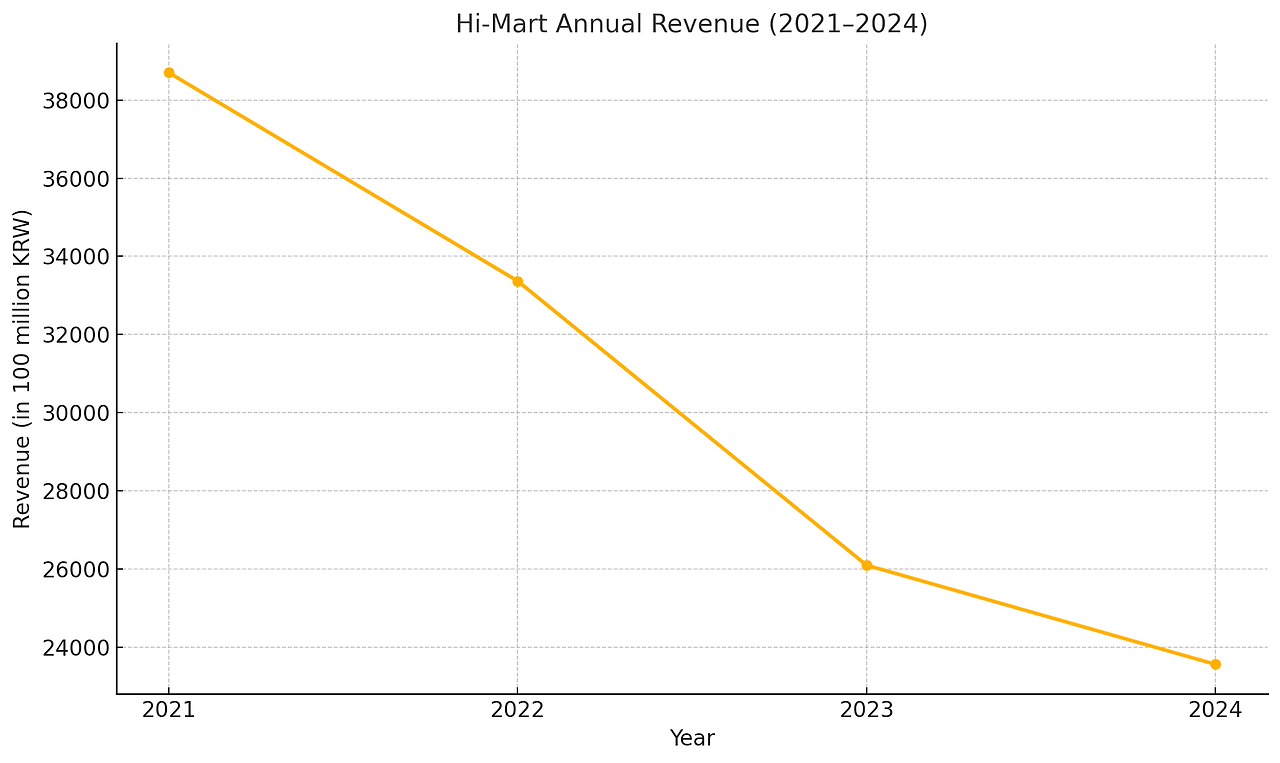 2021년에만 해도 연 매출이 3조 8천억 원이었는데, 2022년엔 3조 3천억, 2023년엔 2조 6천억, 2024년에는 결국 2조 3천억 원대까지 내려갔어. 3년 새 매출이 거의 40% 가까이 줄어든 셈이야. 이쯤 되면, 사실상 하이마트는 큰 위기에 맞닥뜨린 거야.