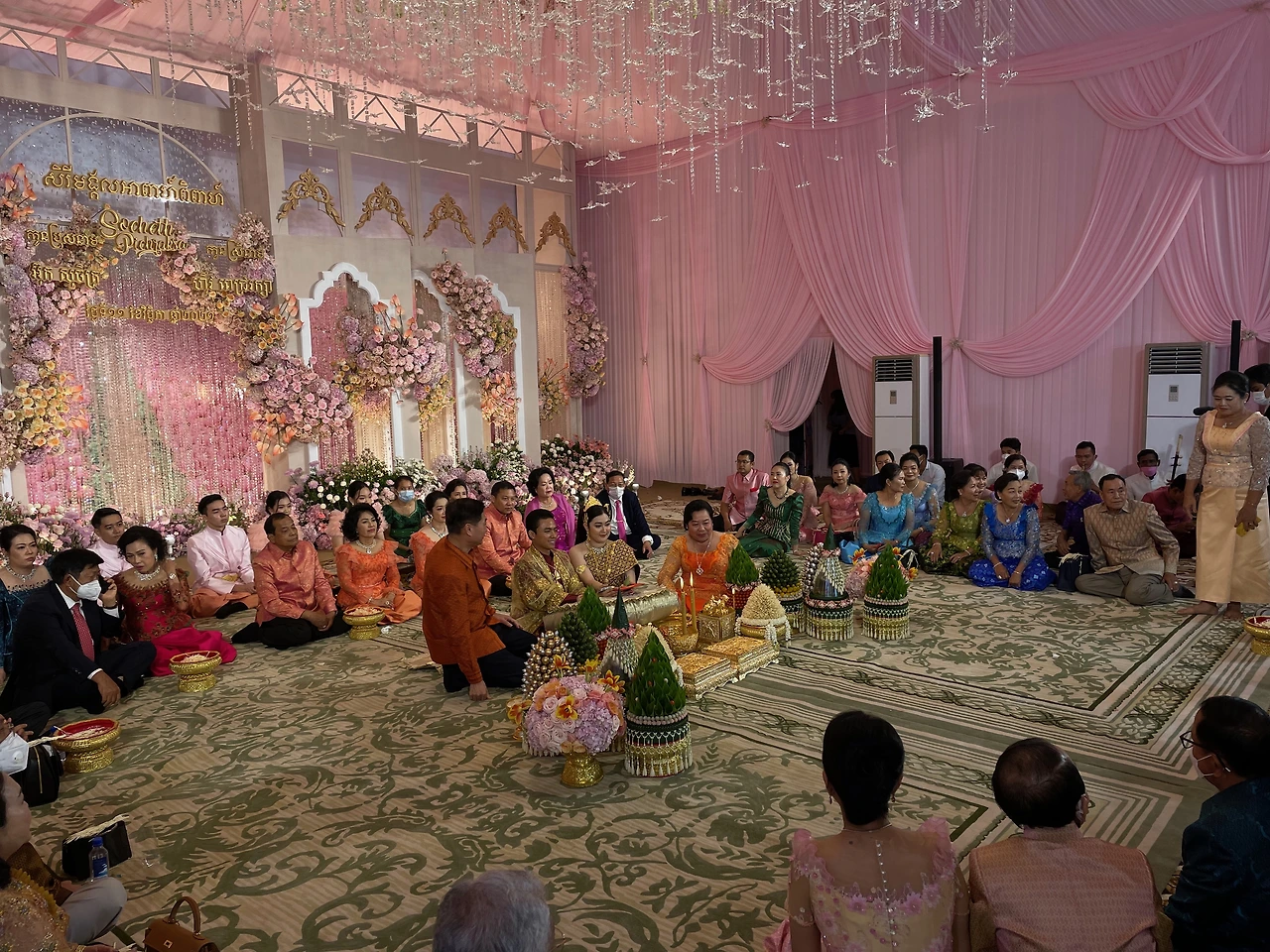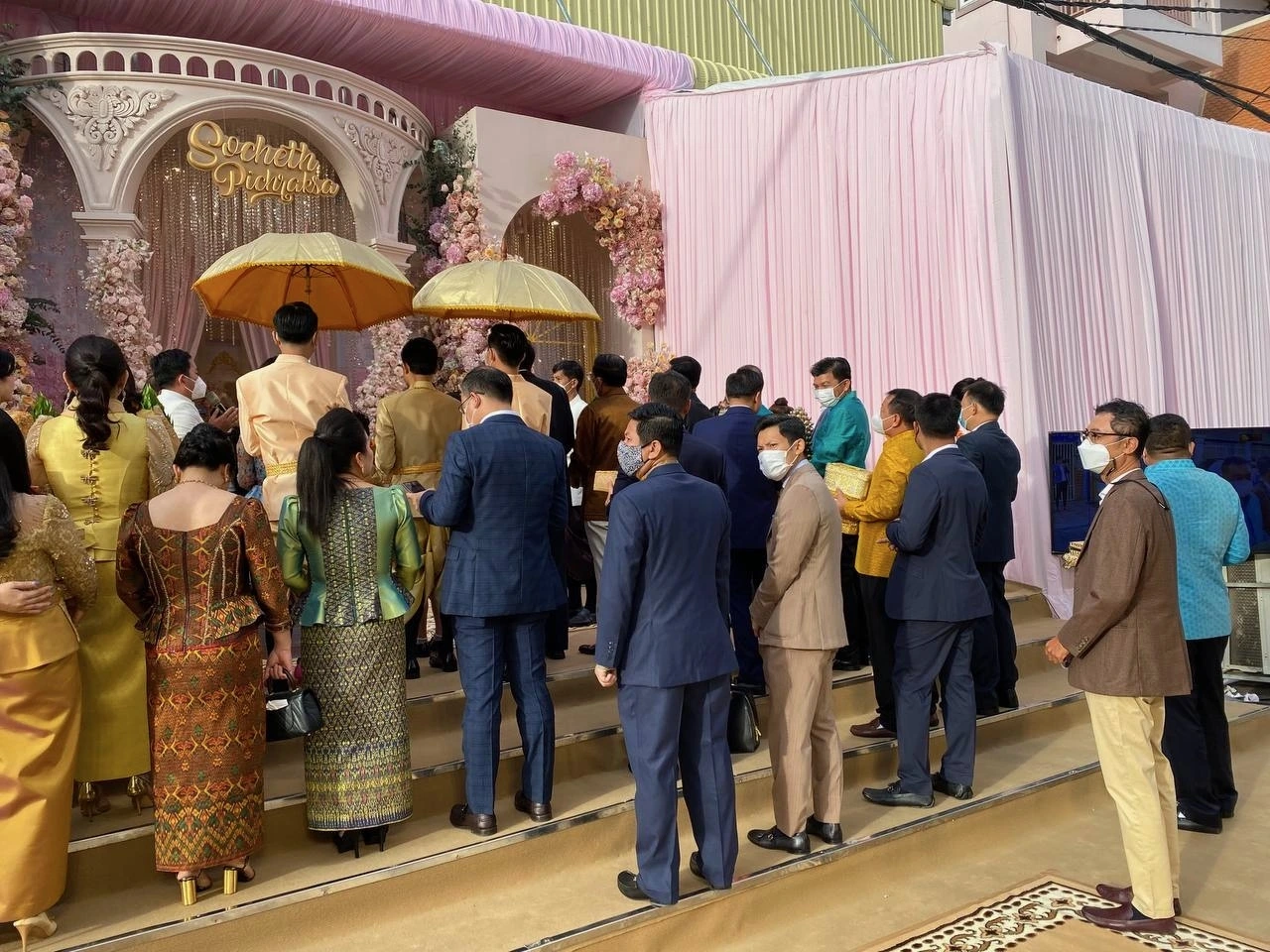그래도 설마 했다. 우리나라도 예전에 코리안타임이 있었듯 여기도 캄보디아 타임이 있다. 절대 제시간에 뭔가가 시작되지 않는다. 그래서 스타벅스에서 커피를 하나 사서 7시가 조금 못되어서 도착하니 어느새 결혼예물 퍼레이드가 진행되고 있었다. 초대한 지인들에게 눈인사를 하고 제일 뒷 줄에 섰다.