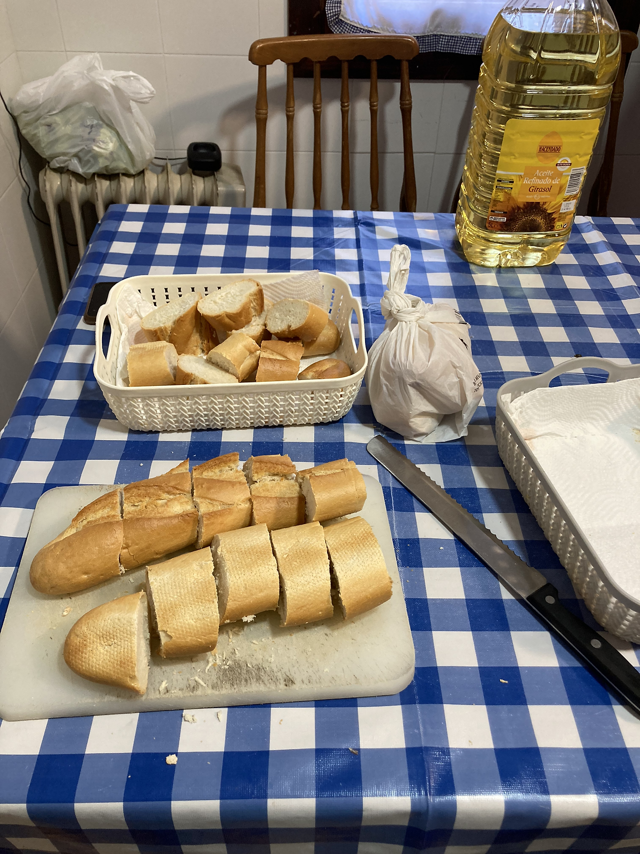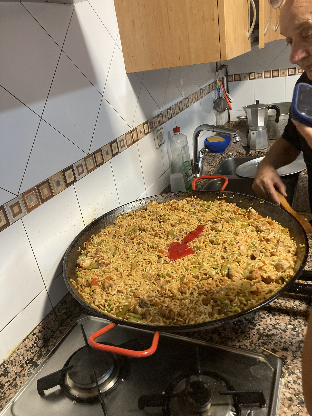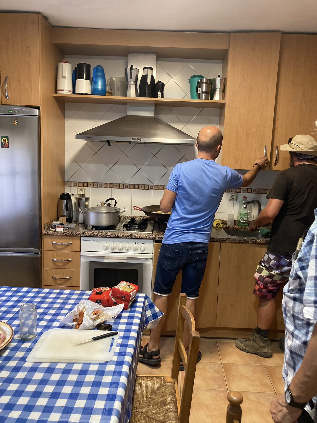 식사 준비를 다 같이 한다는데 순례자 수가 많지 않아서 양이 평소보다 적은 모양이다. 별 도와달라는 말 없이 오스피탈레로들이 척척 하고 있었다. 빵과 야채를 써는 간단한 일을 도왔다. 커다란 빠에야를 만들어 먹을 모양이었다. 호세가 빠에야 가운데 파프리카로 화살표를 만들어 두었다.