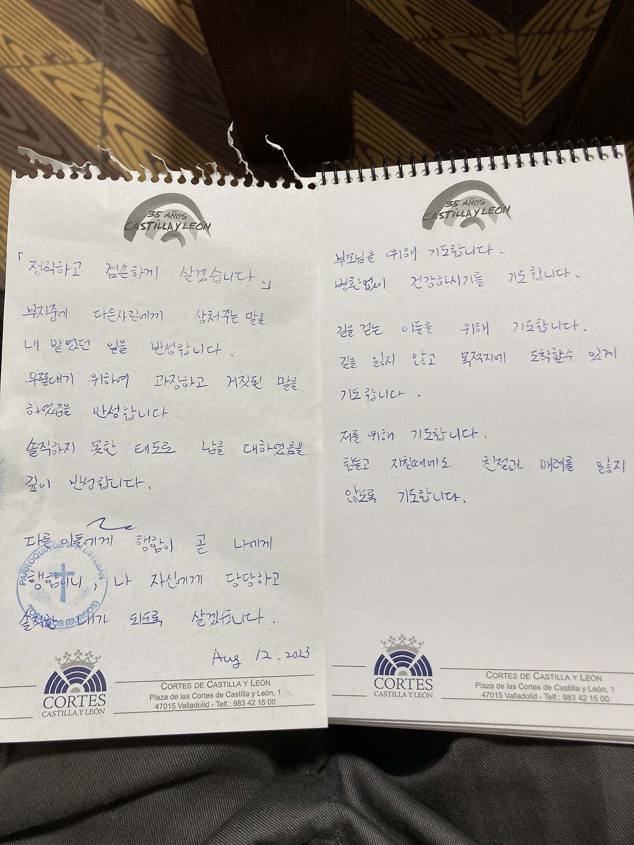 한국 분이 남기고 간 기도문 하나를 크게 읽었다. 순례자가 기도문을 남기고 가면 20일간 함께 읽고 기도하며, 20일을 넘기면 산티아고에 도달한 것으로 보고 다시 1년간 보관할 박스로 옮긴다고 한다. 그리고 1년간 보관한 기도는 마지막으로 교회로 가져가 불에 태우는데, 그게 바로 내일이라고 했다. 멀리 보이는 절벽 중턱에 굴이 있고 거기 교회가 있다 하였다. 절벽의 동굴은 아마도 이슬람과의 전쟁, 즉 레콩키스타 시절의 흔적이 아닐까 짐작해 보았다.