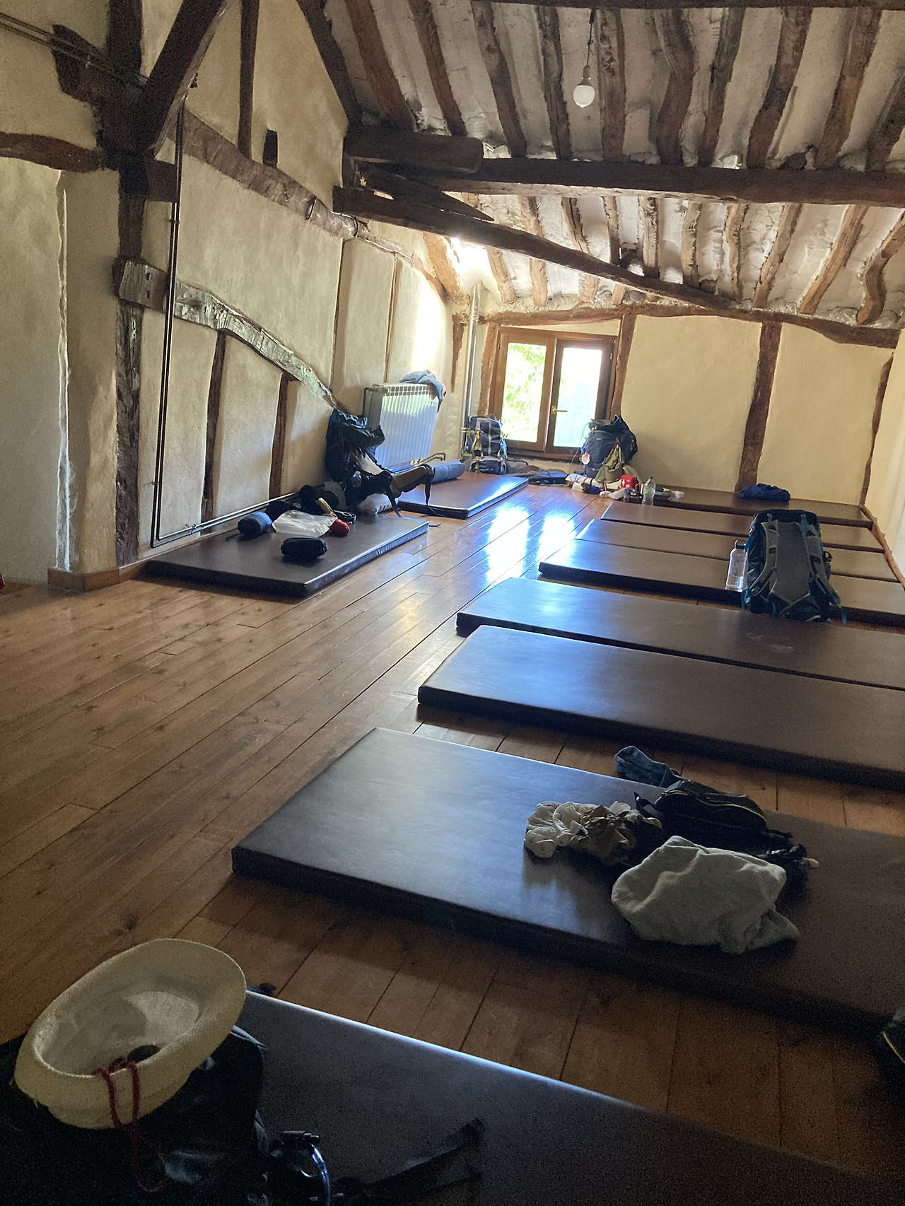 침대가 아니고 찜질방에서나 볼법한 매트리스를 깔고 잔다. 기상시간은 6시이며 그전에는 일어나면 안 된다. 나무 바닥이 삐걱거리기 때문이기도 하고, 은퇴 신부이자 오스피탈레로 호세 루이스의 지론이 “순례자는 잘 쉬어야 한다.”이기 때문이다.