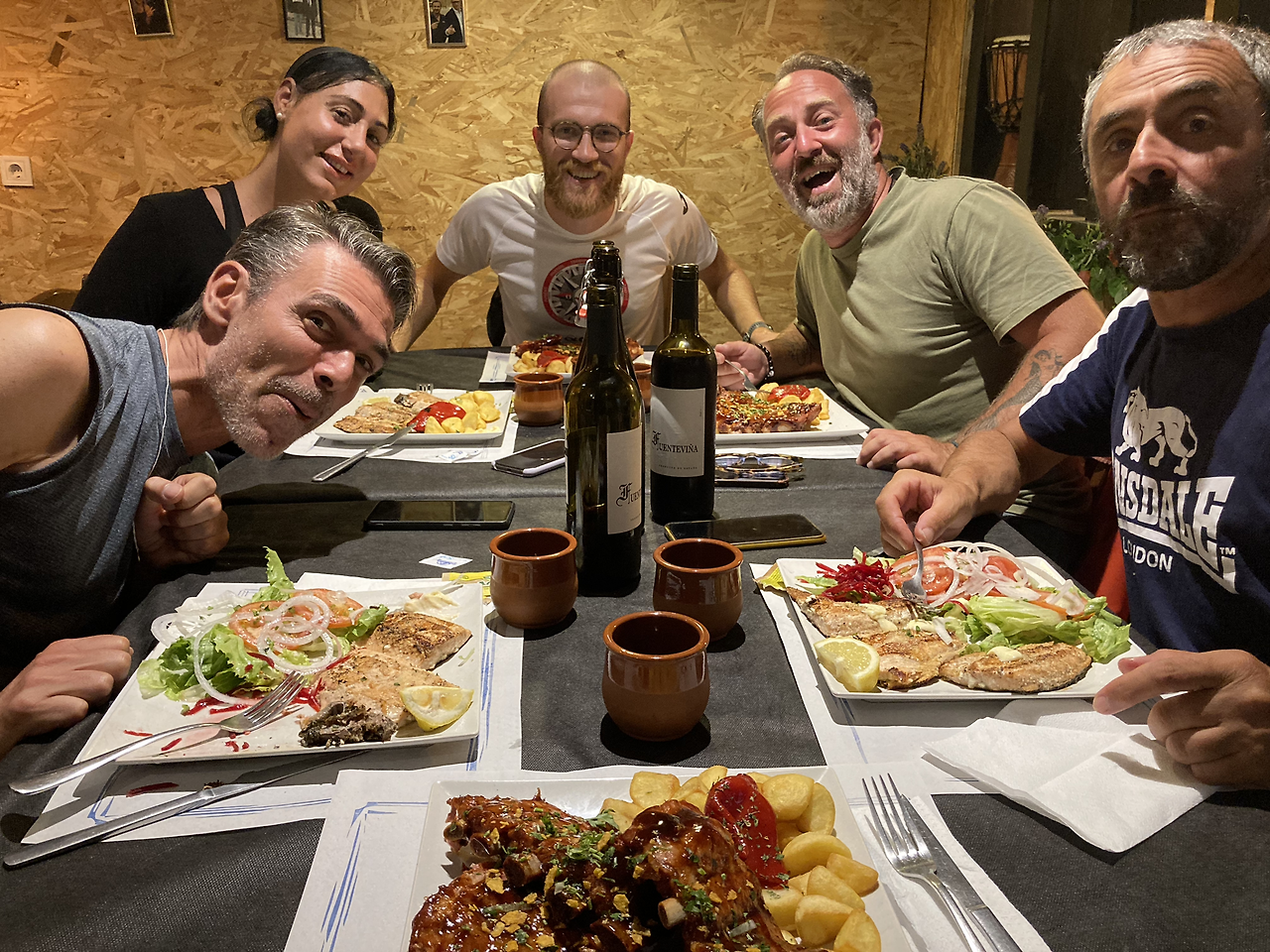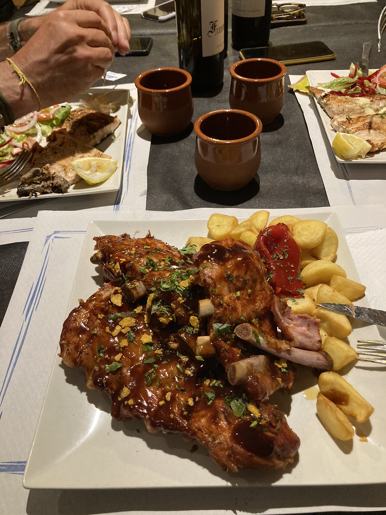 그동안 다른 식당들의 순례자 메뉴는 대체로 만족스럽지 않았는데, 여기는 순례자를 대접하는 느낌이 제대로 났다. 누구는 연어를 누구는 폭립을 시켰는데 푸짐하고 맛도 훌륭했다. 사진으로 보면 적어 보이는데 실제론 접시가 큼지막하다. 와인 두병을 비우고 고기는 미처 다 먹지 못해 싸서 가져왔다.