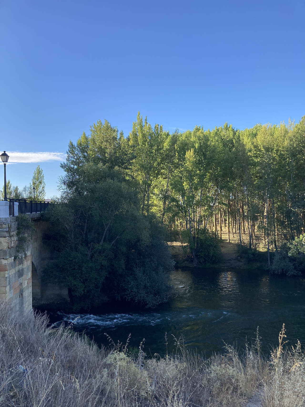 이야기가 끝날 기미는 전혀 보이지 않아서 슬쩍 먼저 나왔지만 굳이 발걸음을 재촉하진 않았다. 큰 오르막이나 돌밭 없는 편안한 길이 계속 이어져 힘들이지 않고 여러 마을을 통과했다. 마을마다 강과 수로가 이어져 물이 풍부하다. 까리온부터는 꽤 큰 강들이 마을 주변을 흘러간다. 아니, 물 주변에 마을이 자리를 잡은 것이다. 물놀이라도 하면 좋겠다고 생각했다.