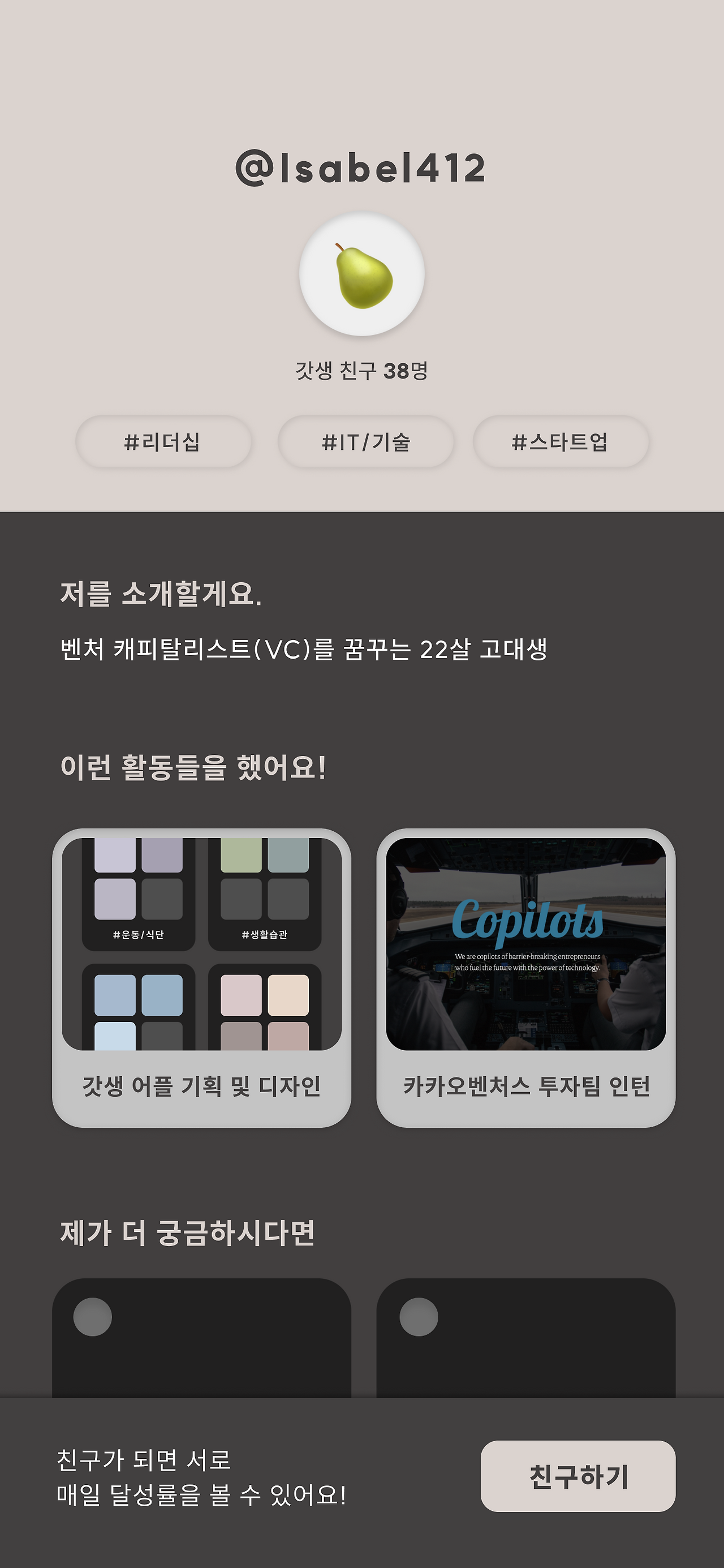 당시 만들었던 프로토타입 화면들 중 일부이다. 프로토타입을 위한 기본 상세 화면들은 모두 완료하고, 기획 자료들과 디자인한 화면으로 갓생 프로덕트 합류에 대한 개발자 예상 수요도 조사한 상황이었다. 하지만 우리는 20명 남짓한 잠재 고객들과의 대면 피드백을 통해 갓생의 한계를 강하게 실감했다.