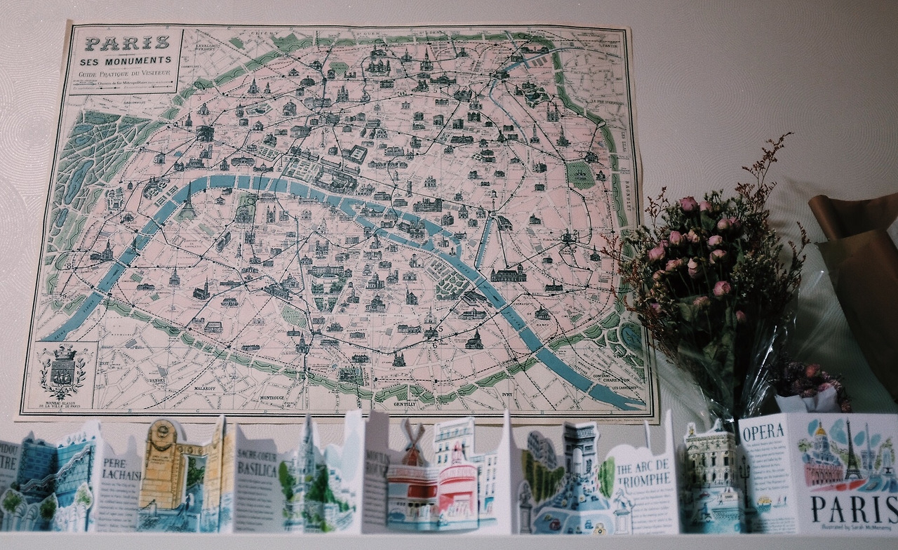 나는 먹을 만큼 먹어버린 것 같은 내 나이가 불안했고, 사람들이 나를 욕하고 싫어하는 것이 무서웠고, 앞으로 어떻게 될지 모를 불투명한 내 앞날이 우울했다. 빨리 어디로 멀리 도망가지 않으면 영원히 잡혀버릴 것 같았다. 이 우울과 불안에. 나를 아무도 모르는 사람들로 가득한 아주 멀고 새로운 곳으로 가고 싶었다. 그리고 예쁜 것으로 가득해서 머무는 순간마다 나를 사로잡을 수 있는 곳을 원했다. 그런 생각들을 하며 웅크리고 누워있던 침대 위에서 몸을 일으킨 순간, 내 눈에 들어온 것은 파리 지도였다. 그래, 파리로 가자.