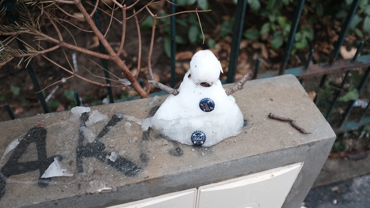 그래서 고른 평일의 어느 요일, 아침 일찍 집을 나섰다. 지하철 역에 내려서는 방향을 잘못 들어 완전히 반대 방향으로 가고 있다는 걸 약간 늦게 눈치챘다. 미사 시간까지는 10분밖에 남아 있지 않아서 순간적으로 화가 나던 차에 귀여운 눈사람이 눈에 들어왔다. 병맥주 뚜껑을 입고 있는 귀여운 눈사람이라니. 게다가 손가락이 달려있는 나뭇가지가 내가 원래 가야 할 방향을 가리키고 있었다. 그 덕에 금세 사그라든 화를 뒤로하고 뛰기 시작했다.