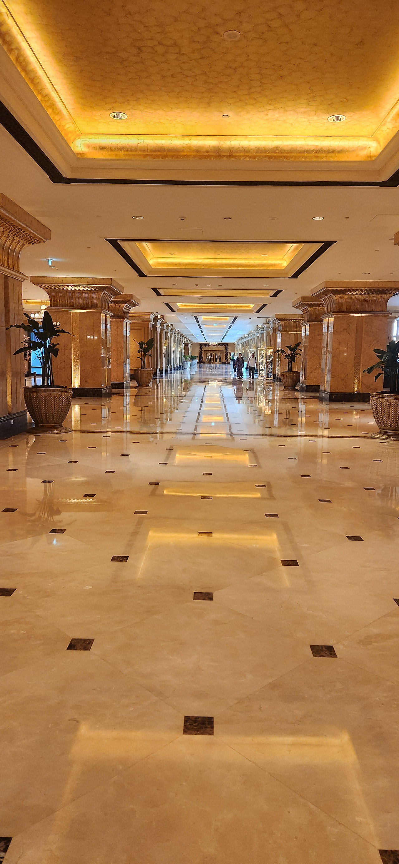 이 호텔은 비공식(?) 8성 호텔인데 화려함의 극치로 유명하다.(계속 같은 말을 반복하고 있다..) 호텔 내부의 모든 인테리어 및 장식은 24K 순금으로 장식되어 있는데 원래는 왕실 전용 게스트 하우스였고 지금도 왕실의 상징물과 만수르 왕자 사진이 전시되어 있다. 아부다비 왕가의 상징적 자산임을 보여주는 건데 방문객을 귀빈으로 대접받는 느낌을 주기 위함이란다.