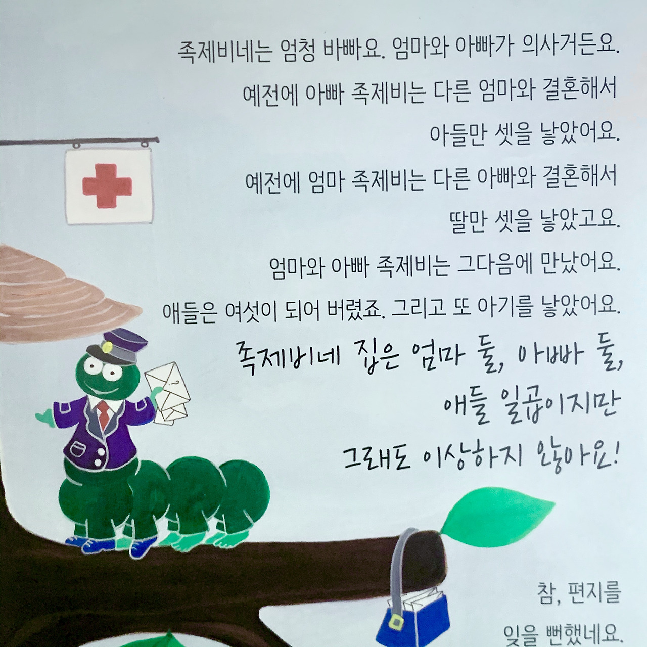 이를테면 이 책의 것은 문장 사이 필기체다. 제목처럼 모두 다른 삶을 담담하게 당연하다고 말한다. 지네 우체부가 다녀간 가족들엔 한부모 가정도 있고, 조손 가족, 입양 가족, 딩크족인 부부, 이혼. 재혼 가정까지 다양하다. 이걸 어른이 만든 단어들로 다시 적고 있으니 이유 모를 죄책감이 든다.