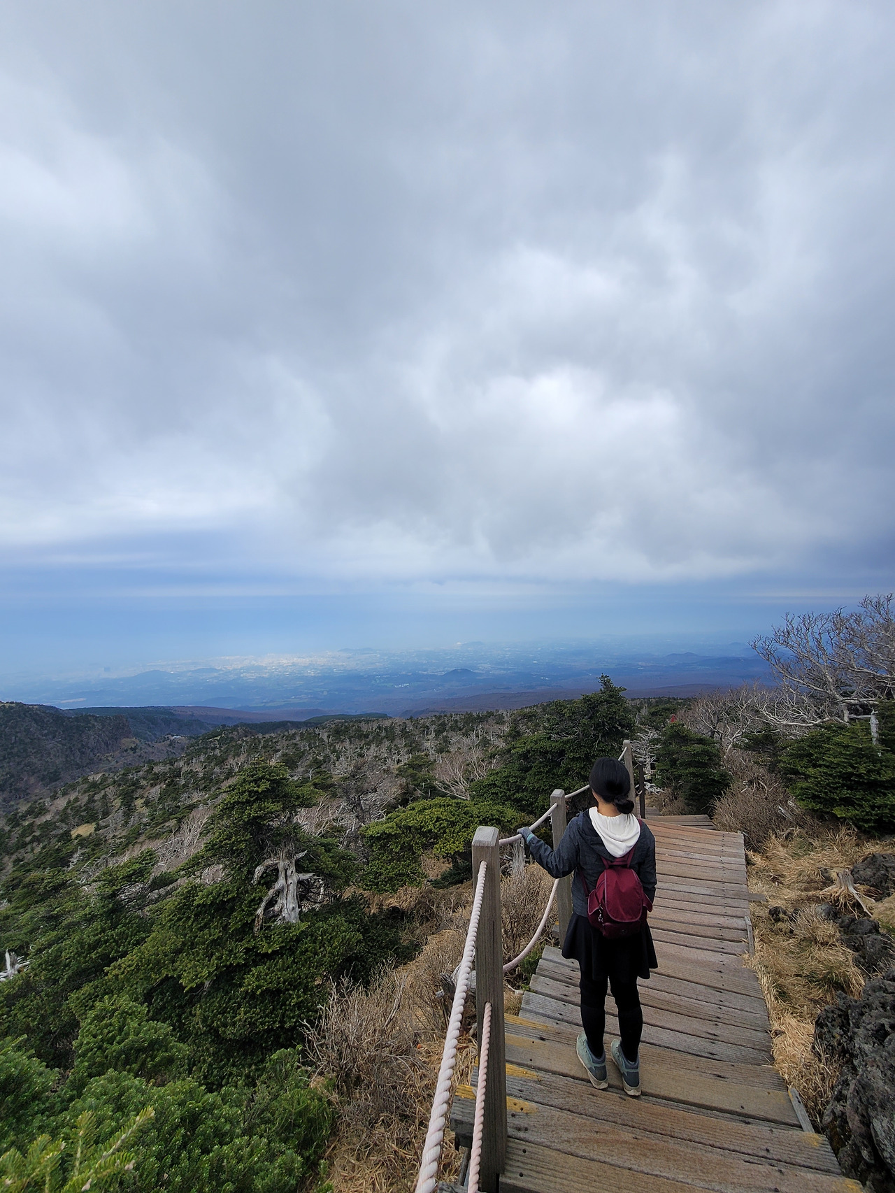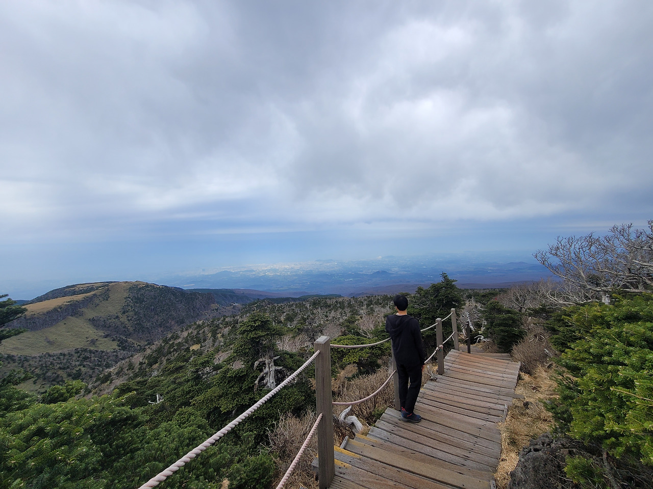 제일 좋았던 구간은 백록담에 오르기 직전, 제주시와 그 앞바다까지 한눈에 내려다 보이는 곳부터 시작되었다. 날이 흐렸는데도 갑자기 시야가 확 트이며 제주 섬의 경계가 한 눈에 들어 왔다.