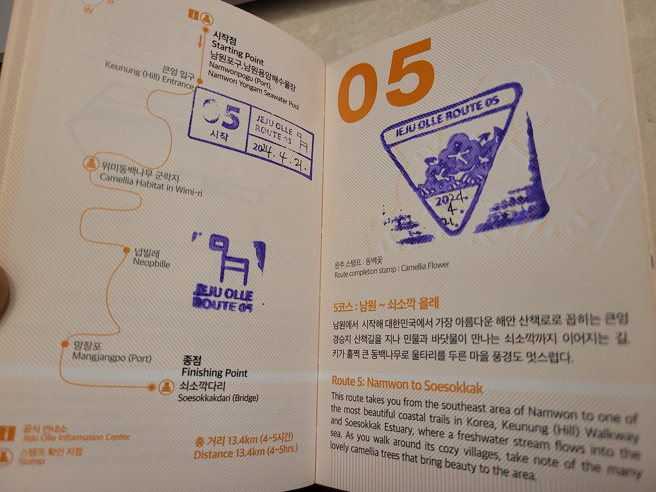 그래도 우려했던 중간 포기자 한 명 없이, 무사히 완주할 수 있어서 너무 다행이었다. 도착 지점인 '쇠소깍 다리'에서 기념 사진도 찍고 도장도 찍으며, 아이들과 엄마에게 소감을 물어 보았다.