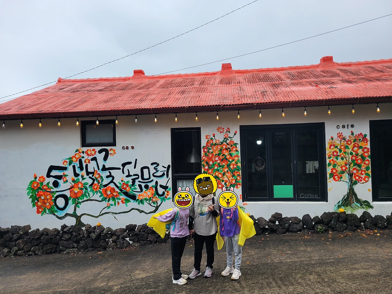 중간 스탬프 지점 맞은 편에는 '동백꽃 필 무렵'이라는 카페가 있었다. 카페 외벽에 그려진 동백꽃 벽화가 너무 예뻐서, 실제 동백꽃은 아니지만 엄마와 함께 사진을 찍어 드리고는 다시 출발했다.
