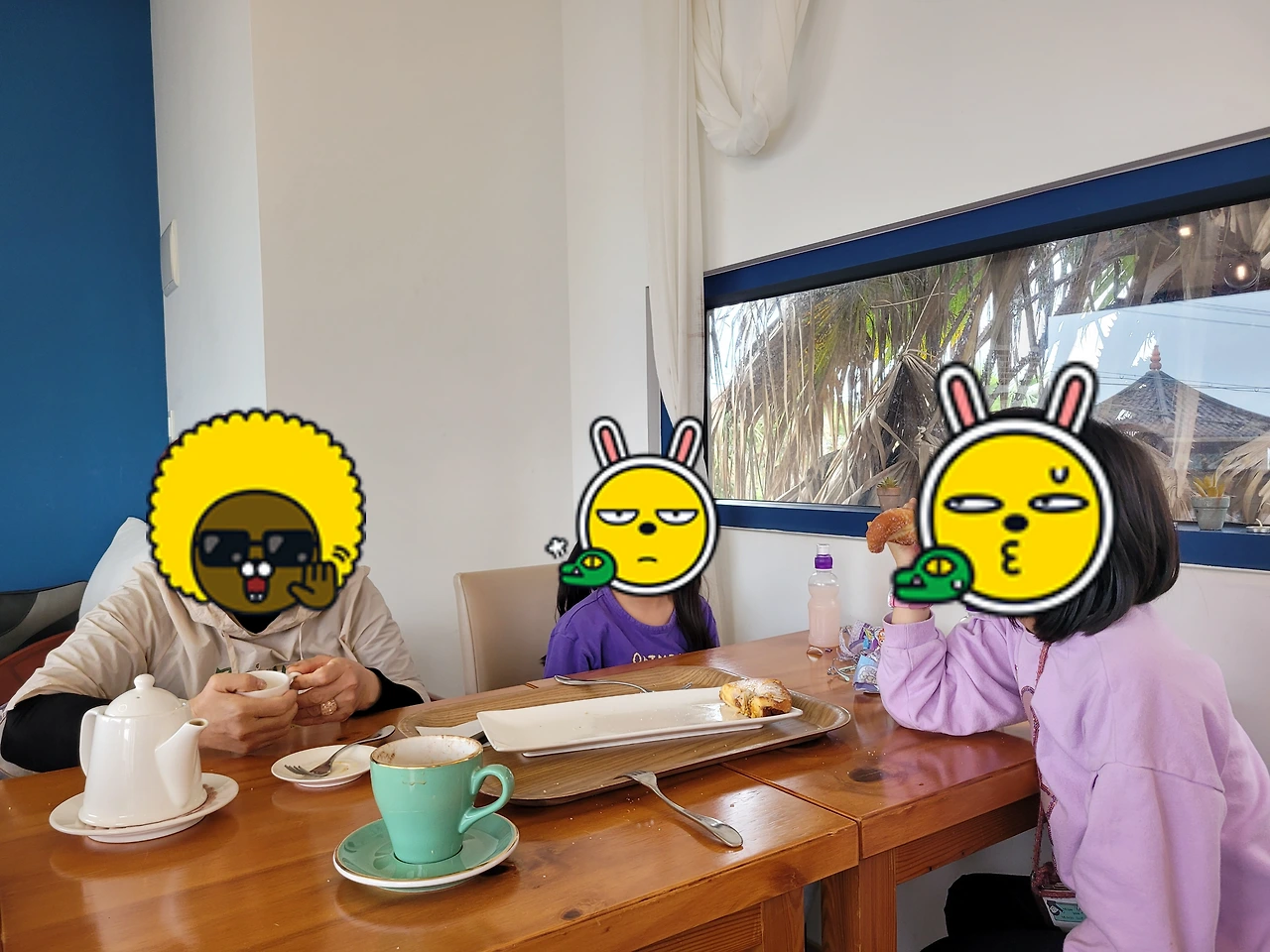 공천포에 있는 '카페 지니'에서 잠깐 아픈 다리를 쉬어 가기로 했다. 여기는 빵도 종류별로 다 맛있고, 커피 맛도 괜찮은 곳이다! 카페인에 약한 엄마는 모과차 한 잔, 나는 카푸치노, 아이들은 음료수를 골랐다.