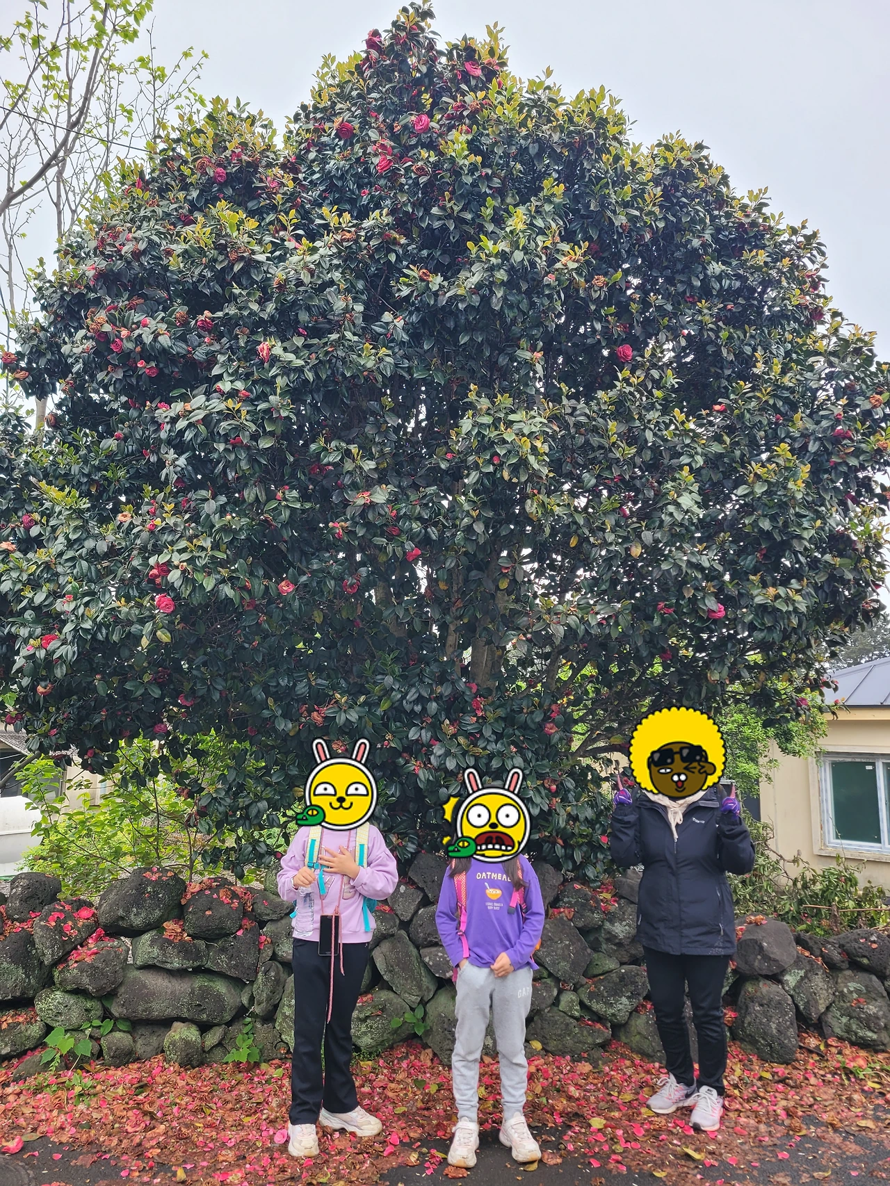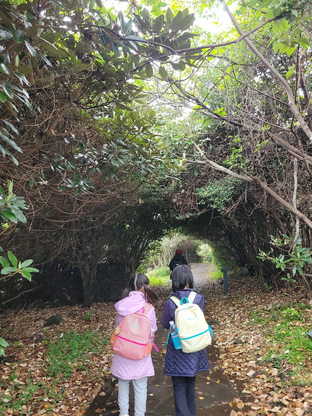 드디어 중간 스탬프 지점인 '위미 동백나무 군락지' 앞에 도착했다. 4월 중순이라 이미 동백꽃이 진 시기였기에 구경할 것이 없어 조금 아쉬웠다. 아이들은 기쁜 마음으로 중간 스탬프를 꽝꽝 찍었다.