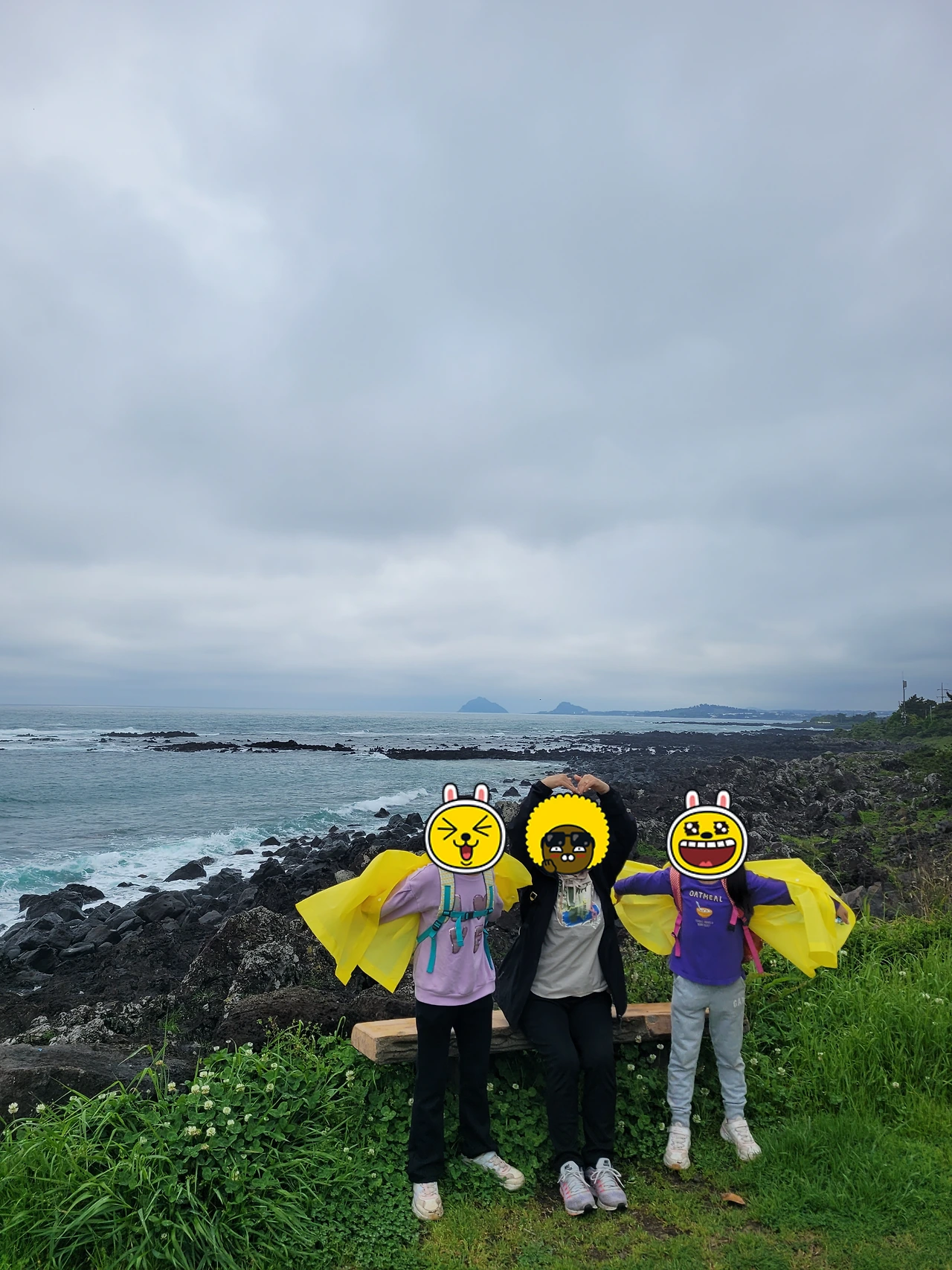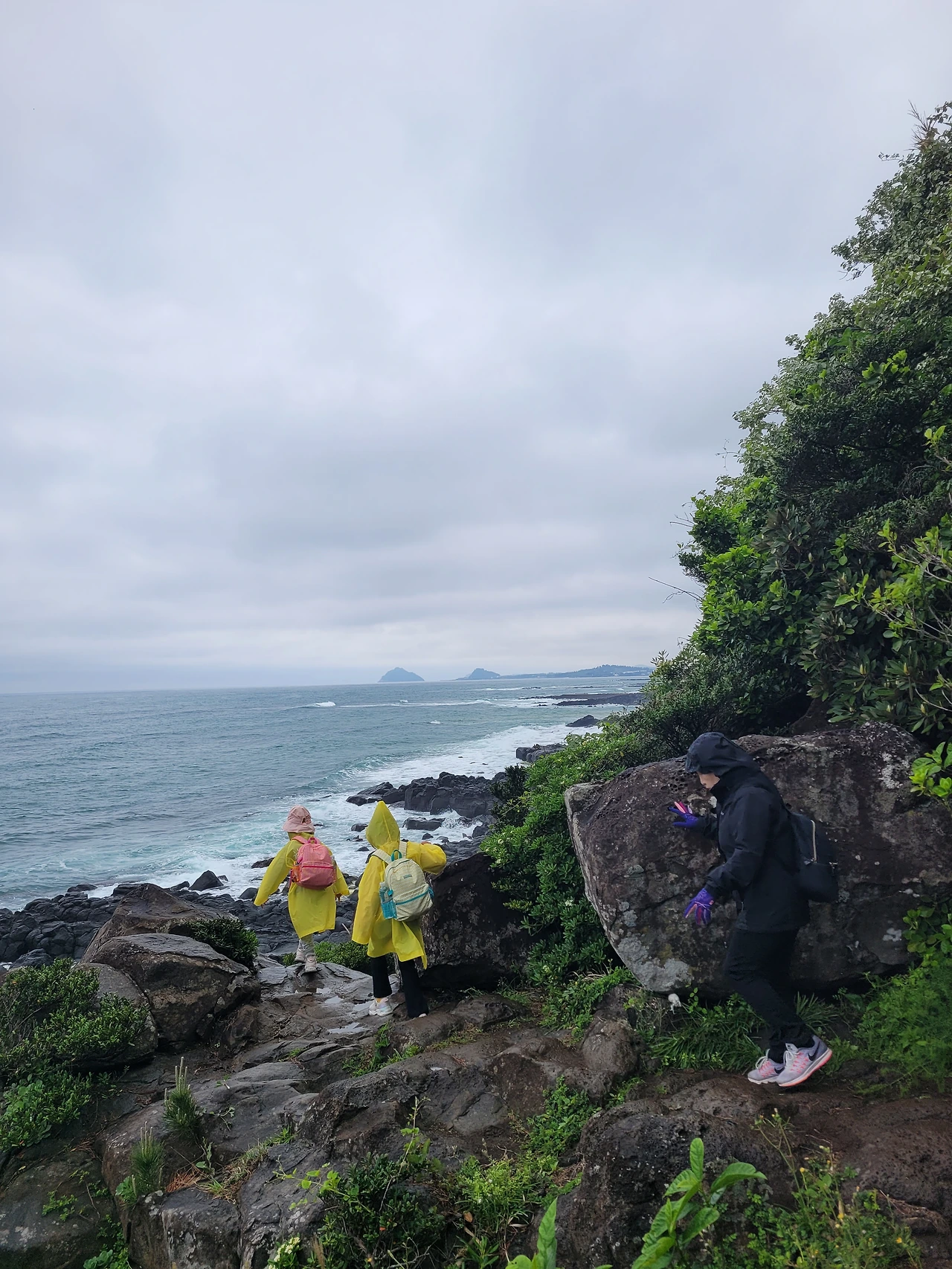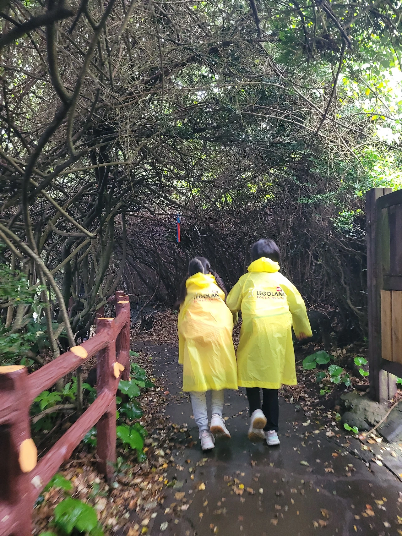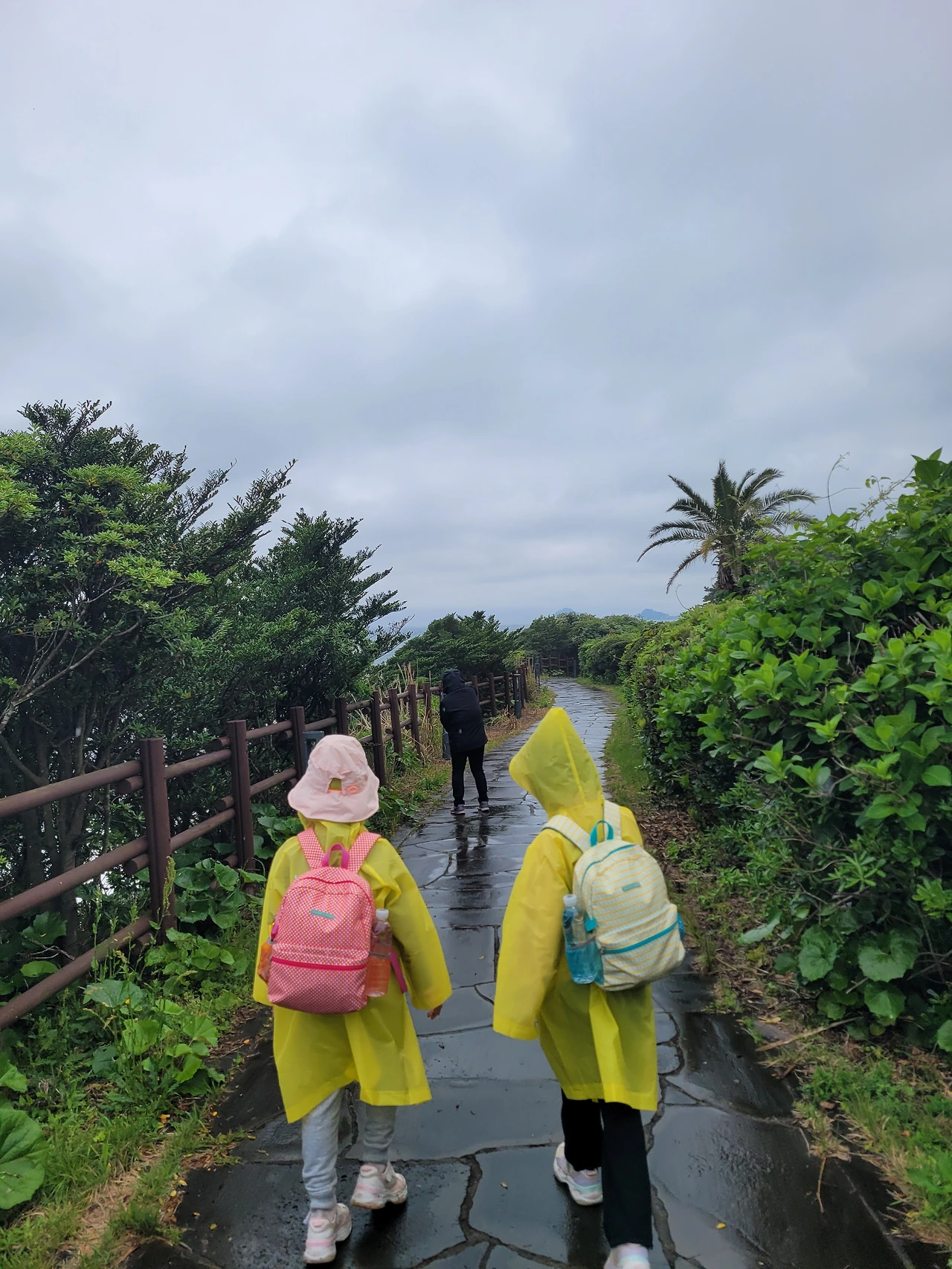 아이들은 한사코 우비 입기를 거절했지만, 나는 기어코 우비를 꺼내 입혔다. 예전에 레고랜드에 놀러 갔을 때 샀던 일회용 우비였다. 과연 이걸 또 쓸 일이 있을까 하며 챙겨 두었는데, 제주까지 가져와서 쓰게 되다니!