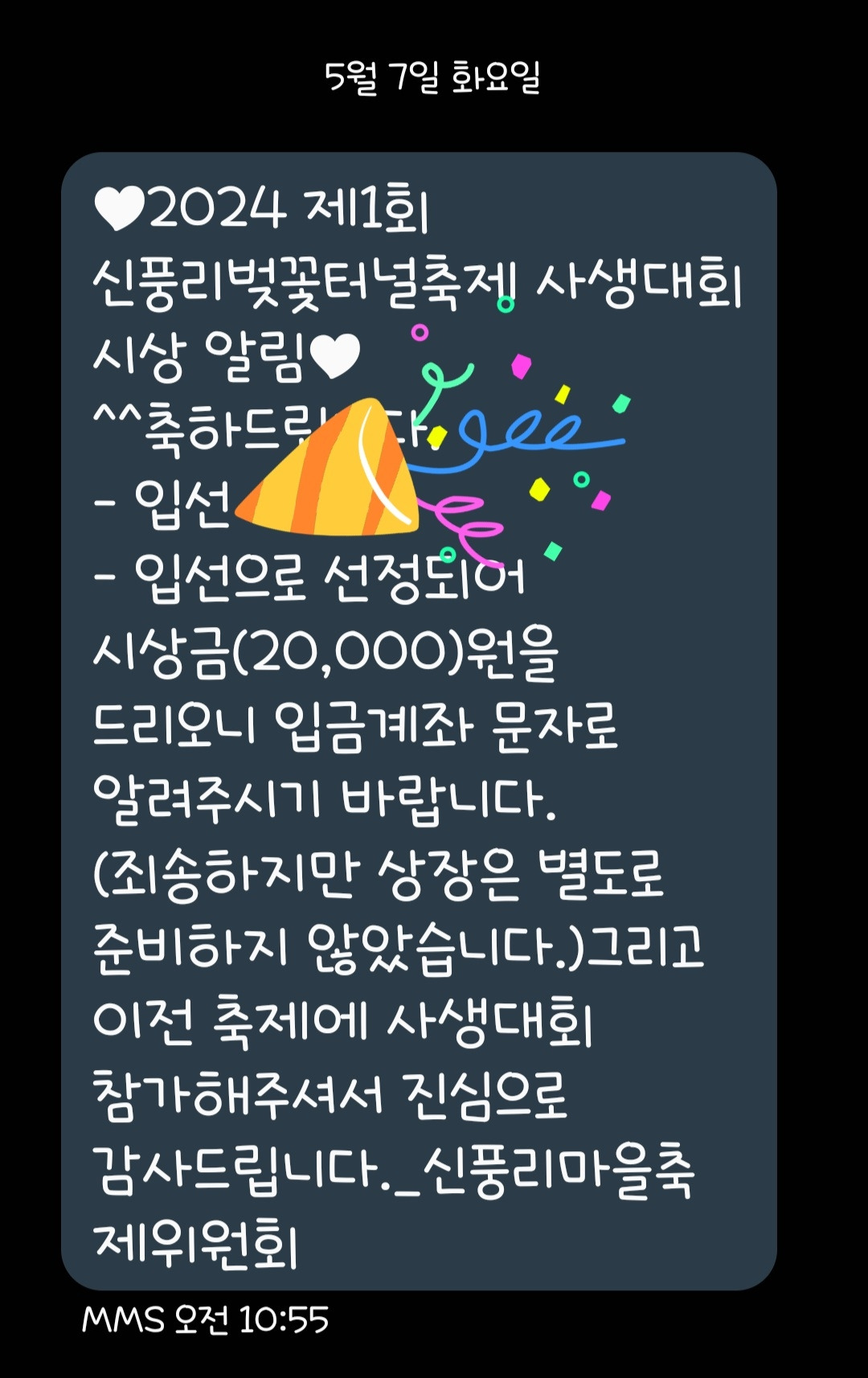 일주일 뒤, 낯선 번호로 한 통의 문자가 도착했다. 예상치 못한 첫째 아이의 수상 소식이었다!! 어떻게든 그림을 그리고 싶어 하던 첫째의 노력이 좋은 결실을 맺게 되어서 더욱 기뻤다.