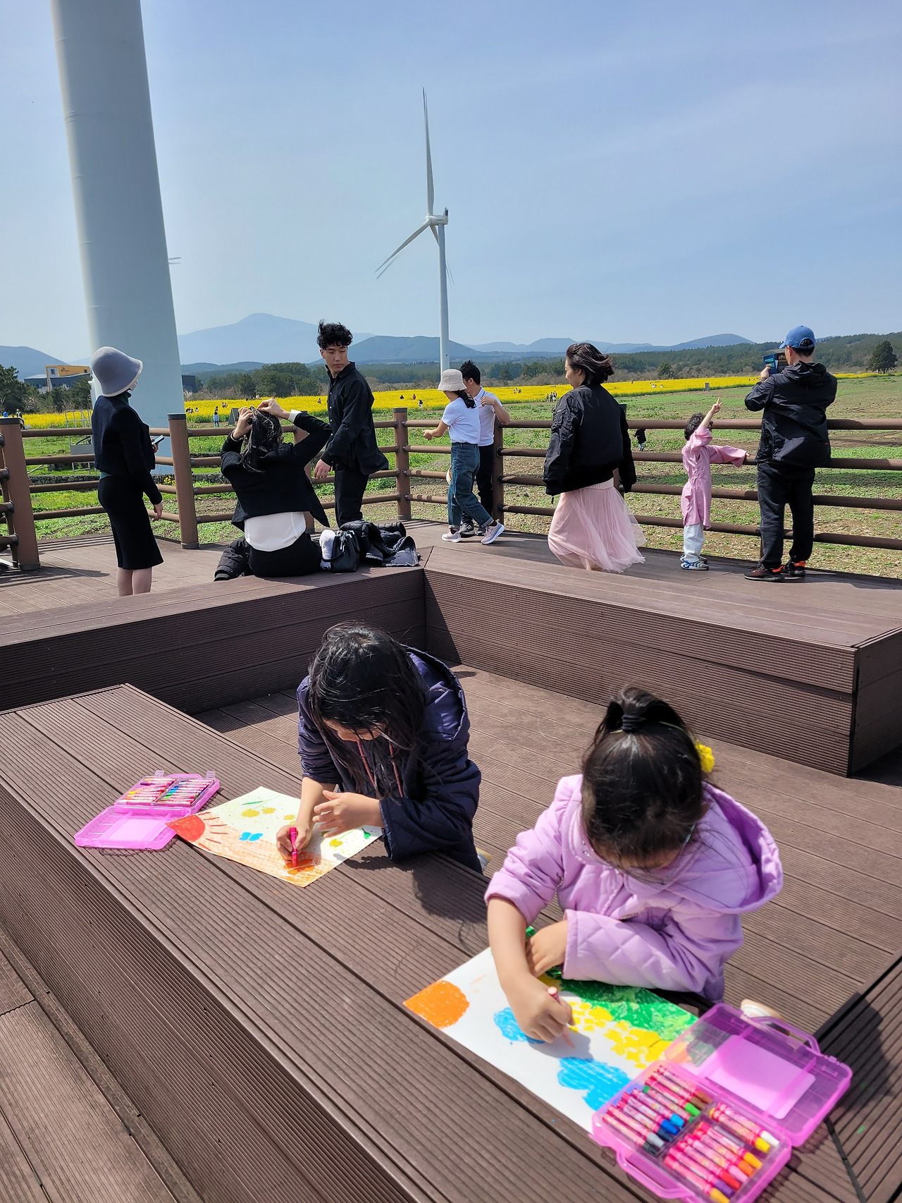 아이들은 불어오는 강한 바람에 종이가 날아가면 주워 달라고 부탁만 할 뿐, 그 외에는 엄청난 집중력을 발휘하며 한 땀 한 땀 소중하게 유채꽃을 그리고 있었다.