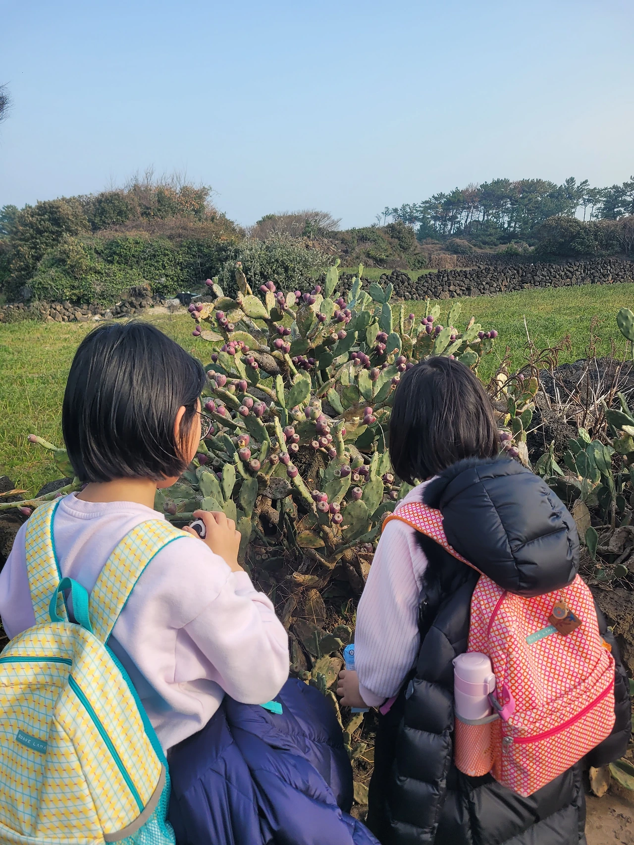 올레길을 23번째로 걷는 오늘, 아이들의 자기 주도성이 굉장히 커졌다는 생각이 들었다. 아까도 침수된 길을 엄마 아빠 허락없이 과감히 건너더니만, 선인장도 냅다 만져버리는 클라스 보소!