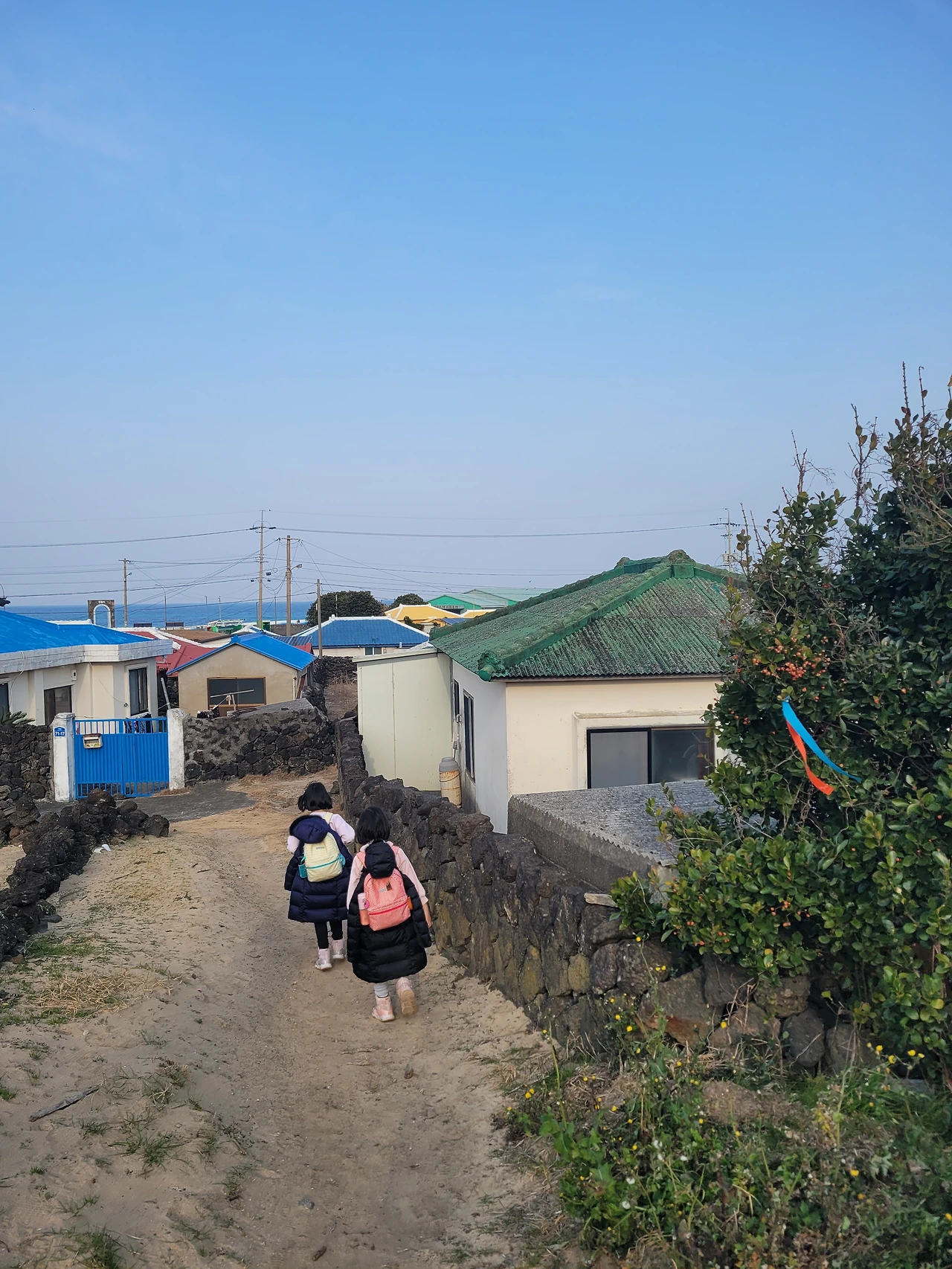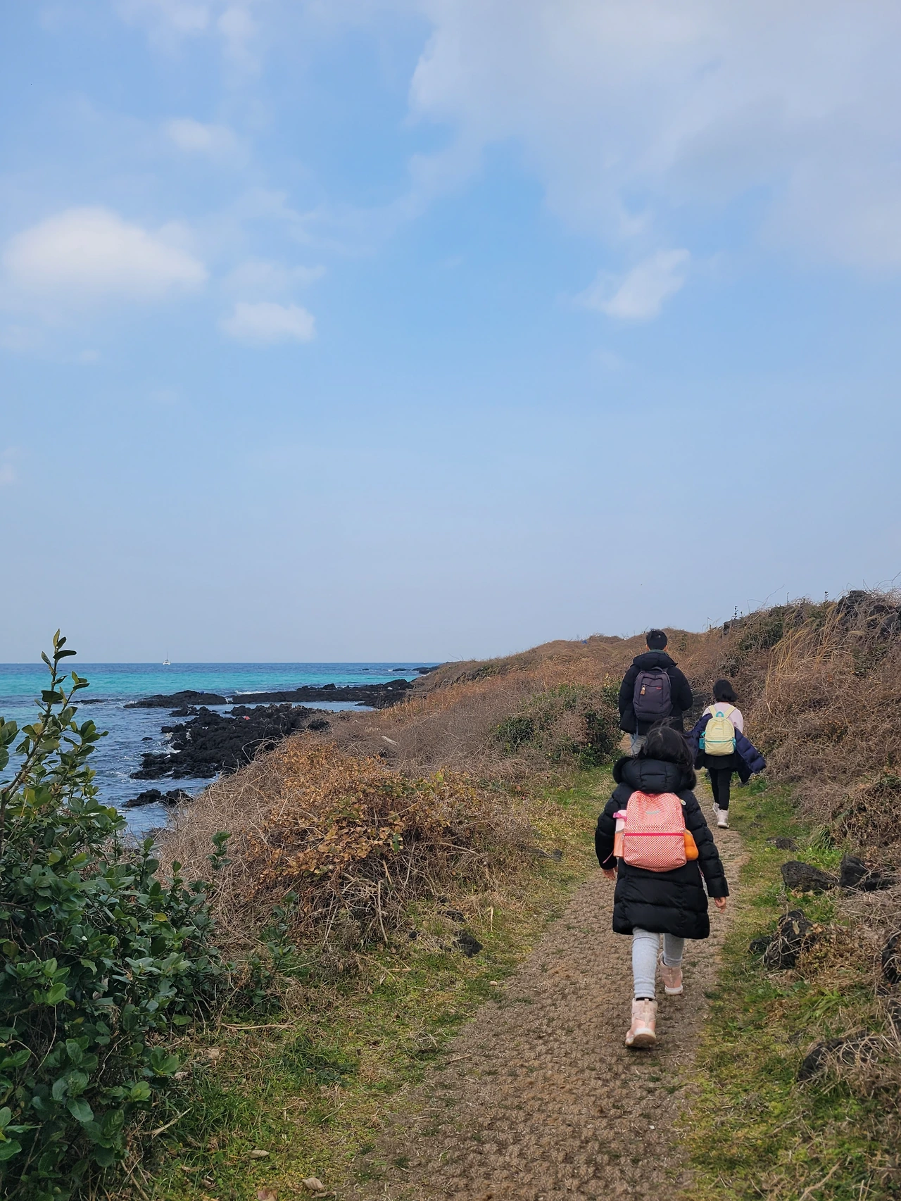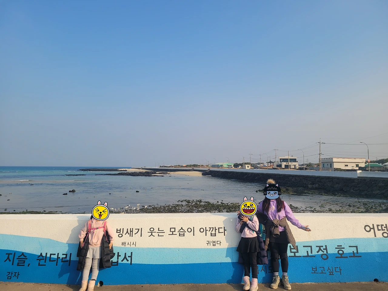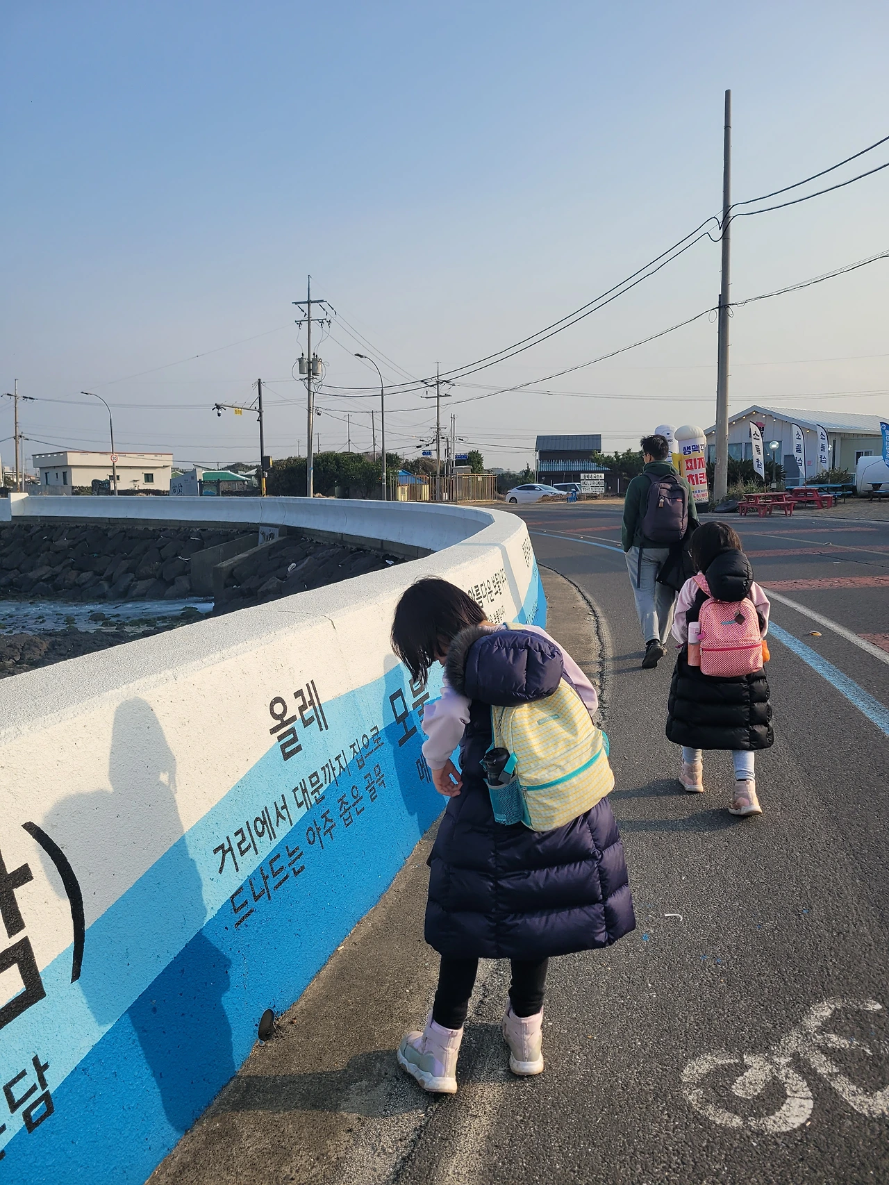 "얘들아, 이제 진짜 조금 남았어! 저기 우리가 가봤던 해녀 박물관 보이지? 저기까지만 가면 끝나니까 힘내!"
