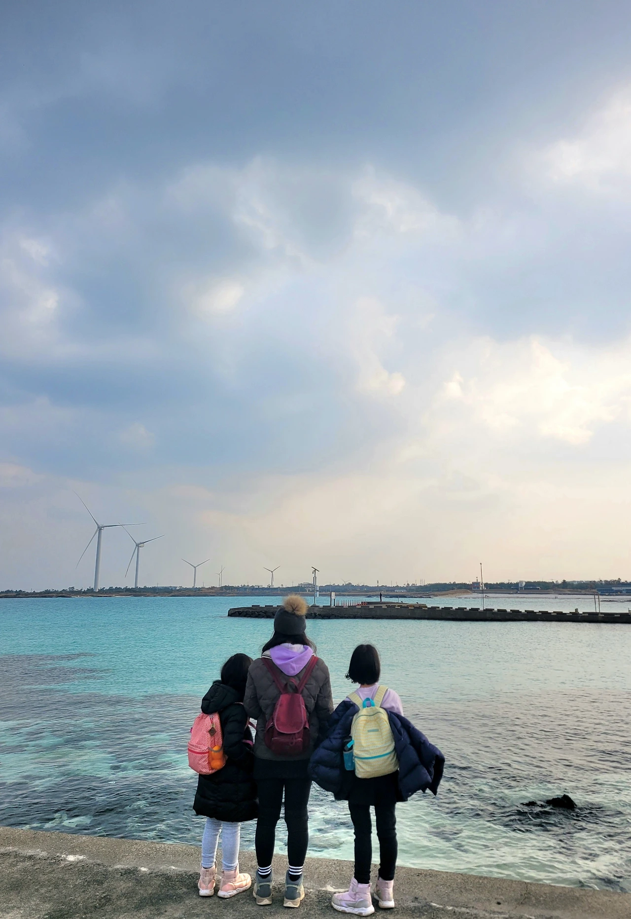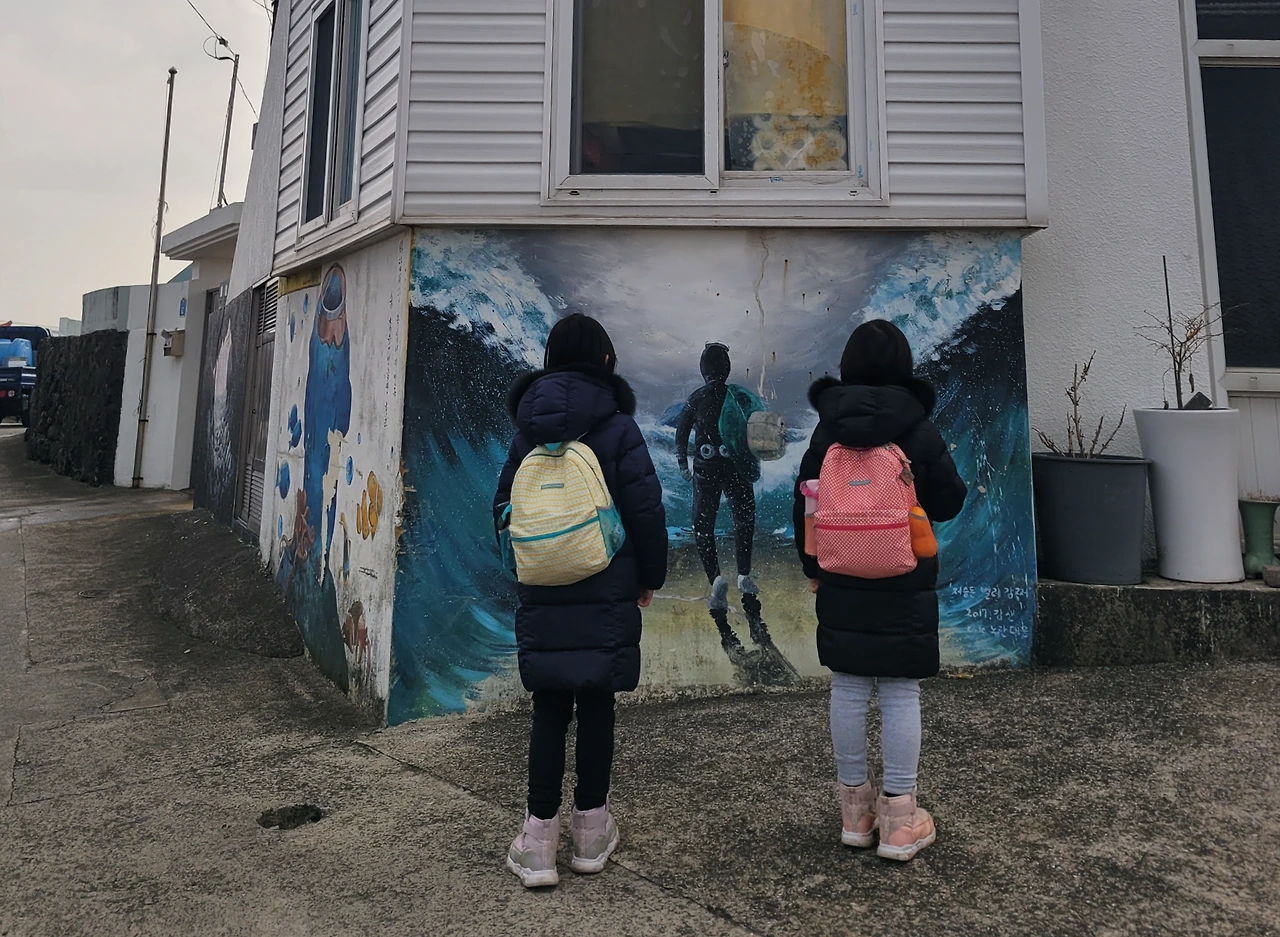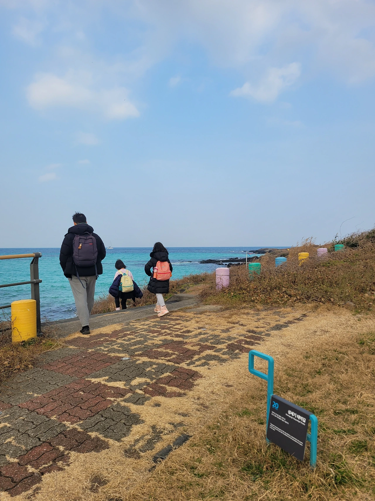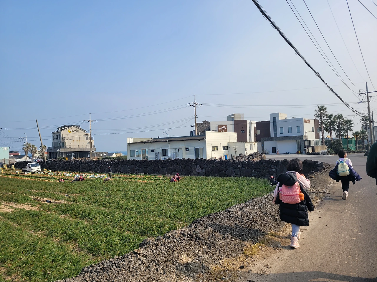 "얘들아, 이제 진짜 조금 남았어! 저기 우리가 가봤던 해녀 박물관 보이지? 저기까지만 가면 끝나니까 힘내!"