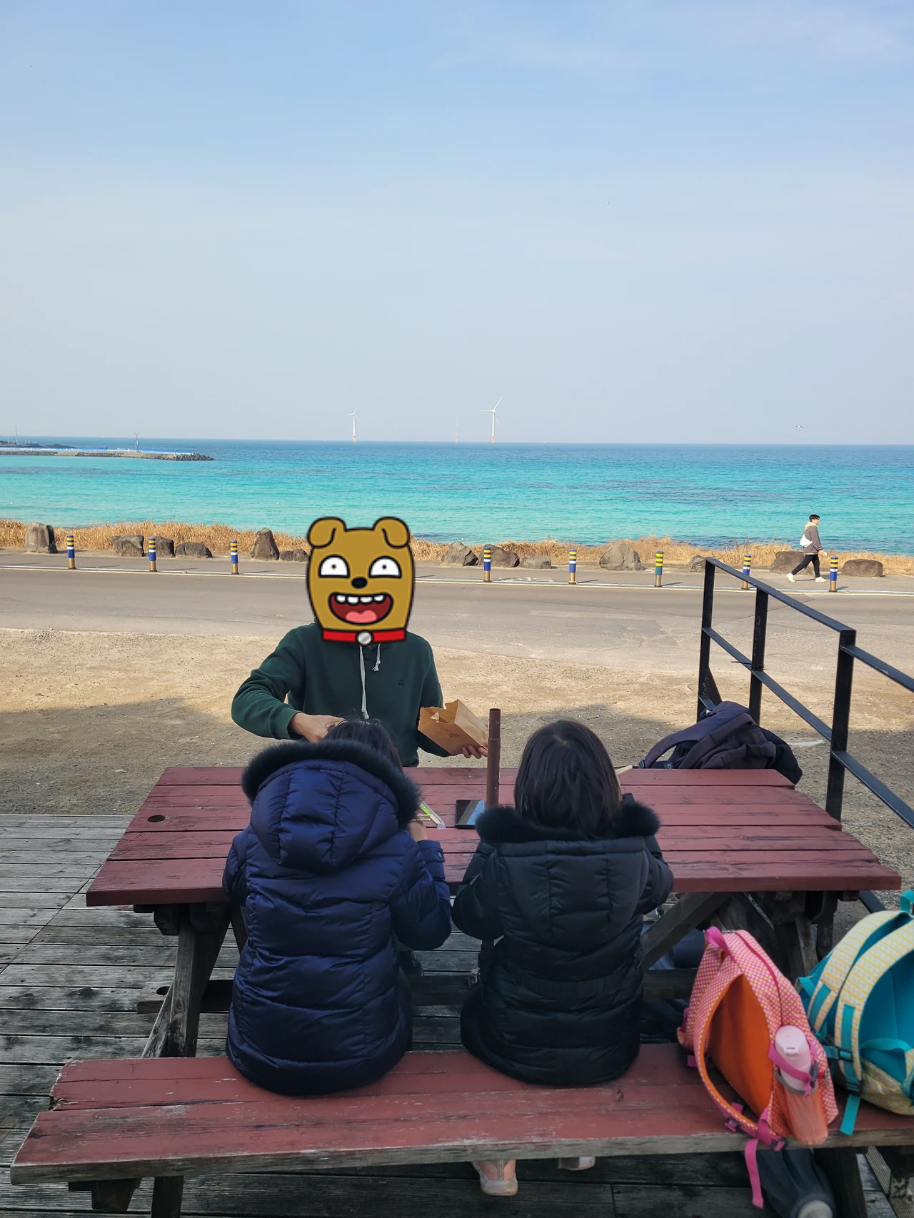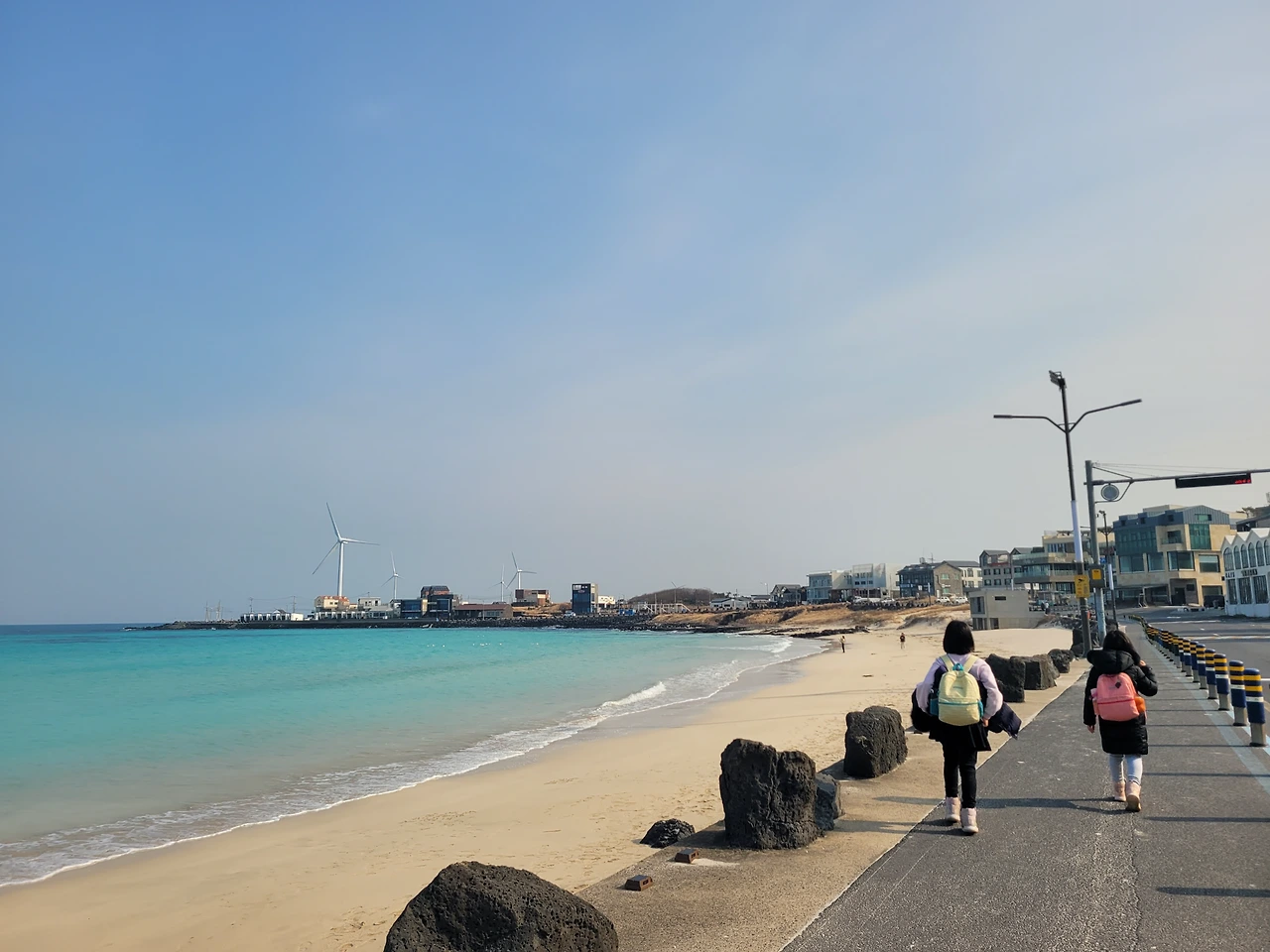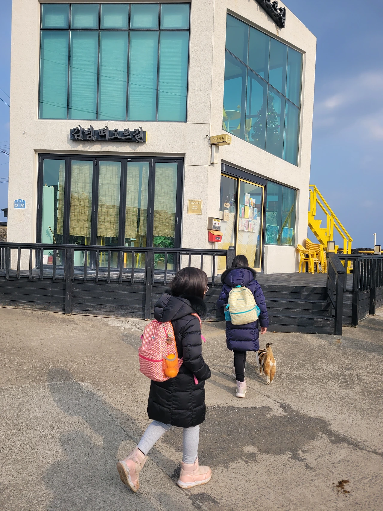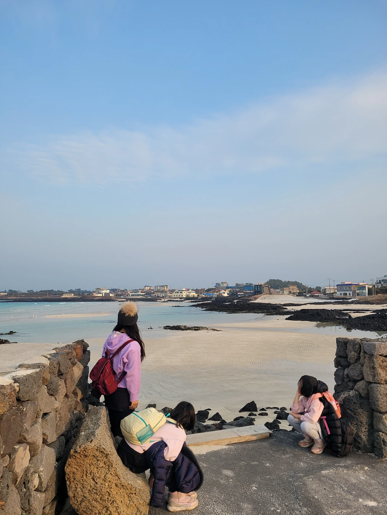 "얘들아, 이제 진짜 조금 남았어! 저기 우리가 가봤던 해녀 박물관 보이지? 저기까지만 가면 끝나니까 힘내!"