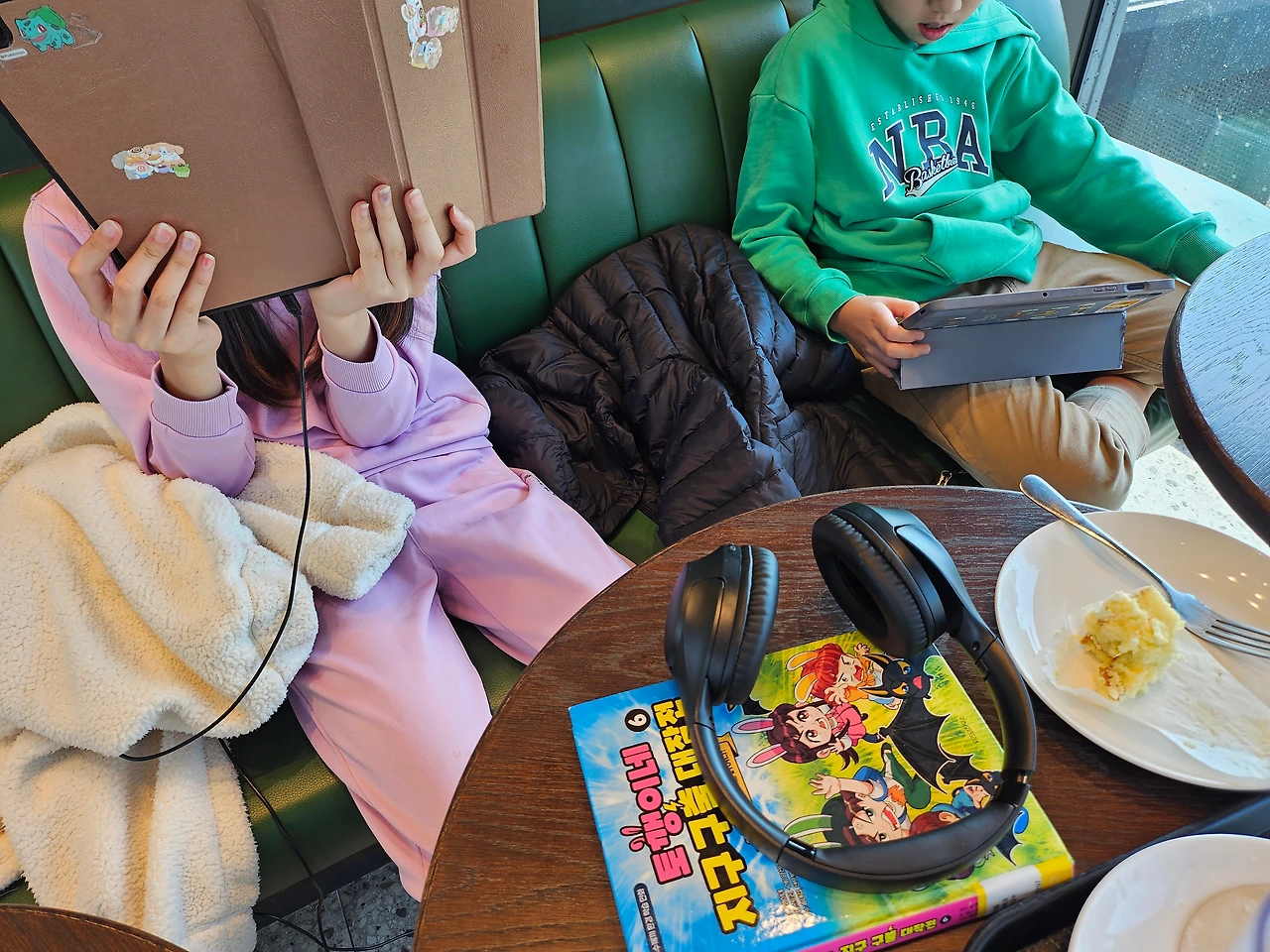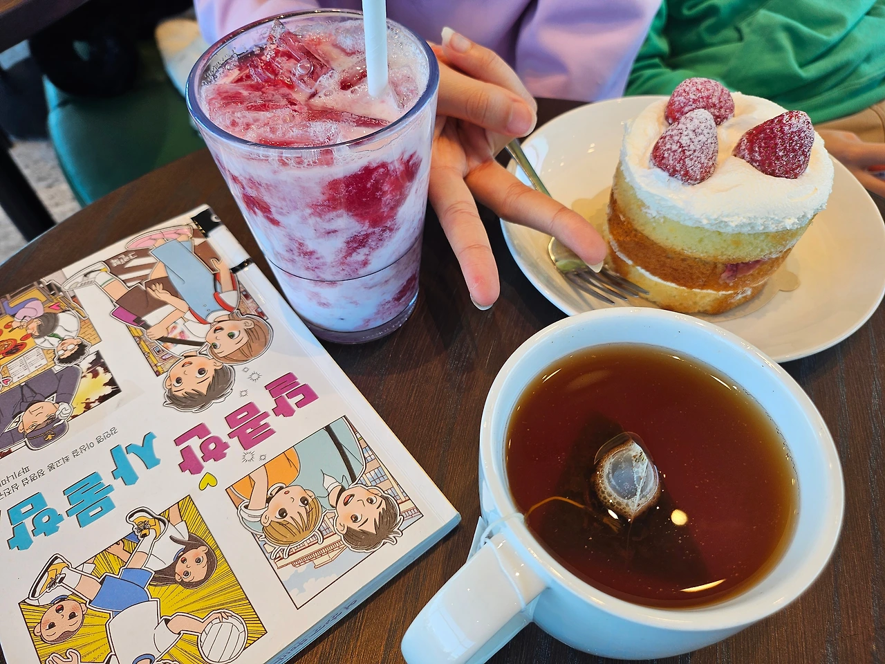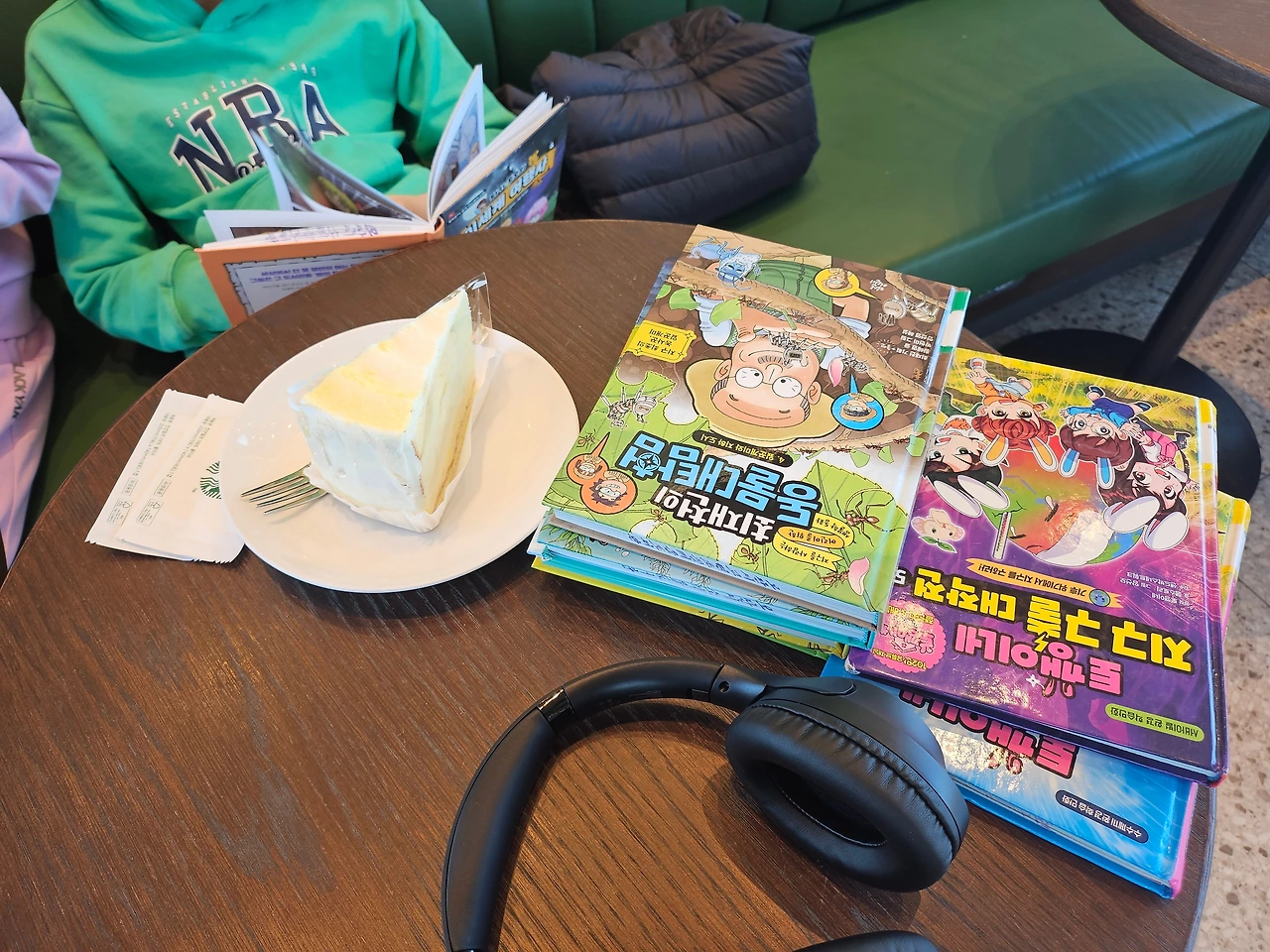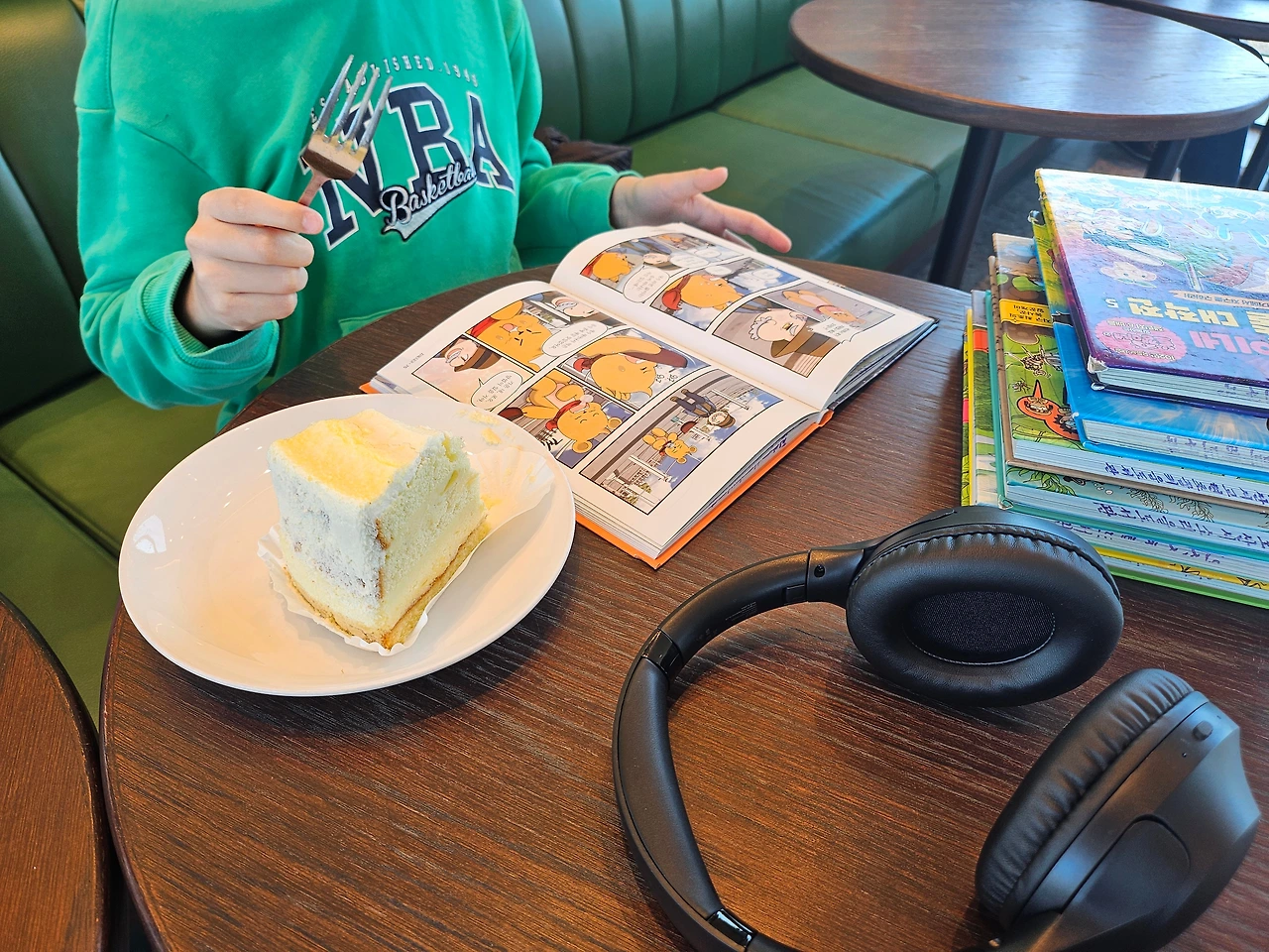 드디어 번호가 호명되고 케이크와 음료를 받아온다. 아직 만화가 섞인 책을 좋아하는 봉봉, 글 많은 책은 누나 꺼라고 아주 친절하게 양보해 주는 스윗보이, 책을 나몰라라 하다가도 책에 빠지면 밤새서 책을 읽으시는 딸이기에 음료를 받아오는 뒷모습은 '너무 감동적인데...' 말 안 듣고 둘이 싸우고 하다가도 사랑스러운 체리와 봉봉이. '어이구 이것들 이쁘기도 하지~' 엄마는 고슴도치가 되어 그저 흐뭇하게 바라본다. "자 이제 이거 먹어!"