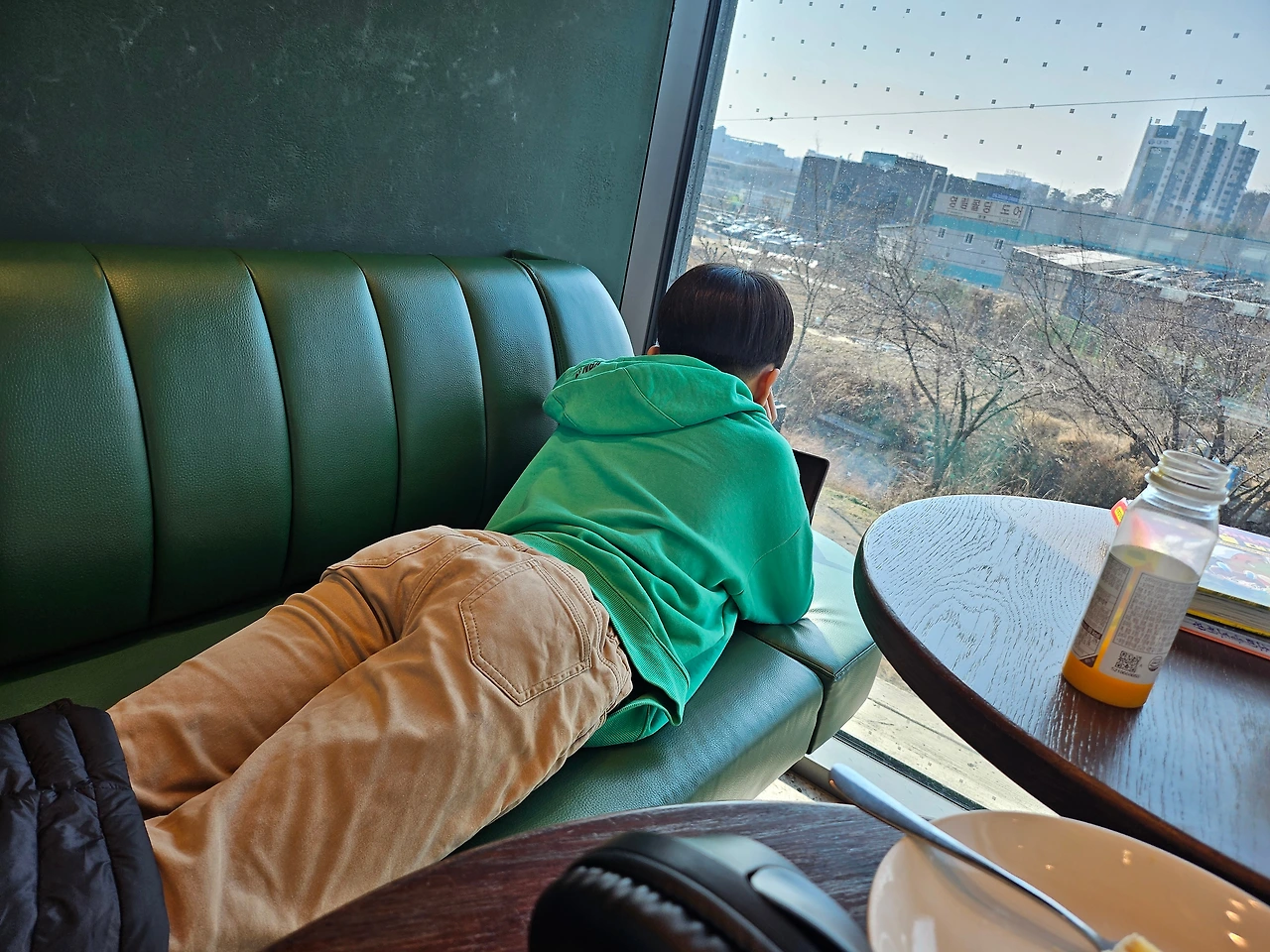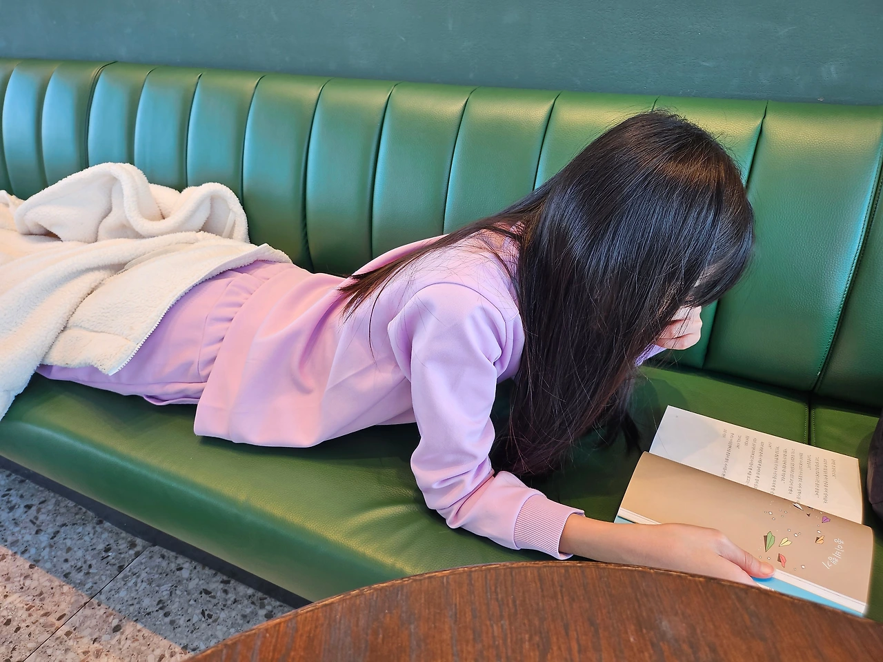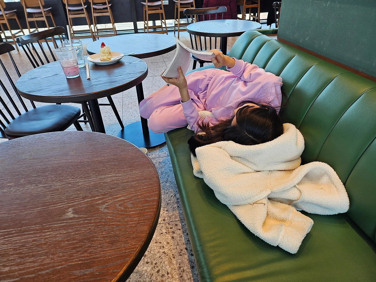 "엄마 나 텁텁해! 목말려" 결국 물이라도 사줘야 하나, 우유를 사 먹어야 하나 봉봉이와 손을 잡고 카운터로 향한다. 한라봉 주스와 물을 부탁해서 받아왔다. '이긍 왔다 갔다로 쫑나는 구나!' 엄마는 서서히 내려놓음이 시작된다. 그리고 다시 한 모금 마시 책을 붙잡는 찰나 '올~ 레~~~~~~' 나의 원픽 구석! 아저씨 부대들이 나가신다. '와우~ 땡큐. 감사합니다. ' "빨리 옮겨! 옮겨~~~~"자리를 잡았다고 꿈쩍 안 하는 체리, 그나마 순순히 따라오는 봉봉이를 앞세워 창가 구석으로 향한다. 지난번 체리가 친구 만나러 갔을 때 봉봉이랑 왔던 터라 봉봉이는 아주 여기가 자기 세상인 편하고 자기 안방인 줄 안다. 체리도 눕는다.