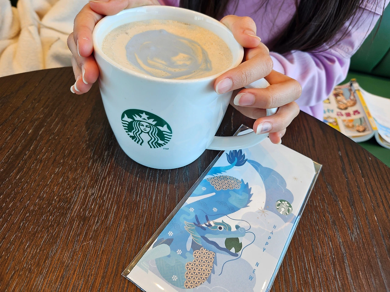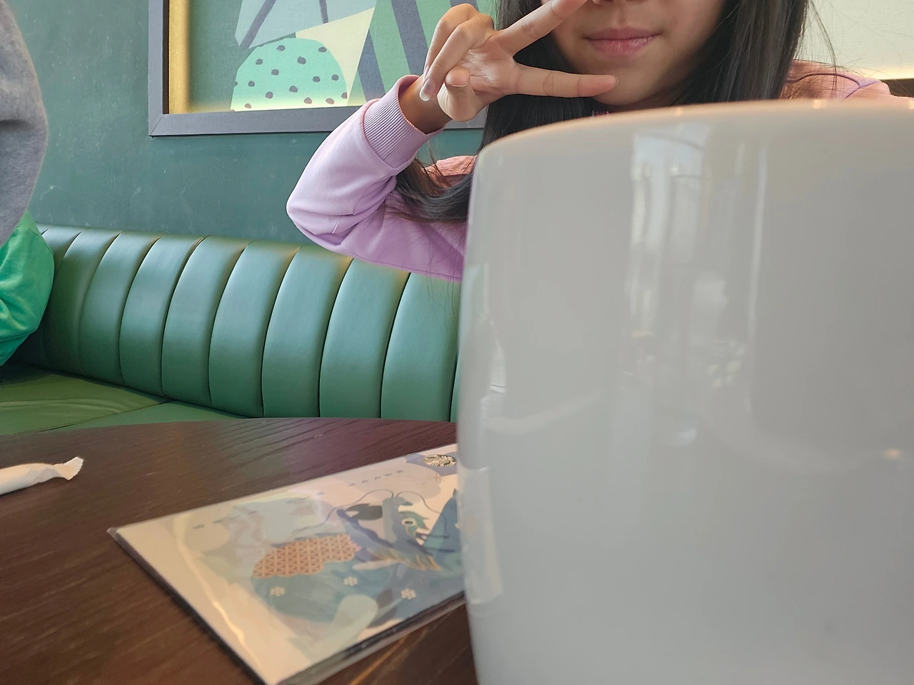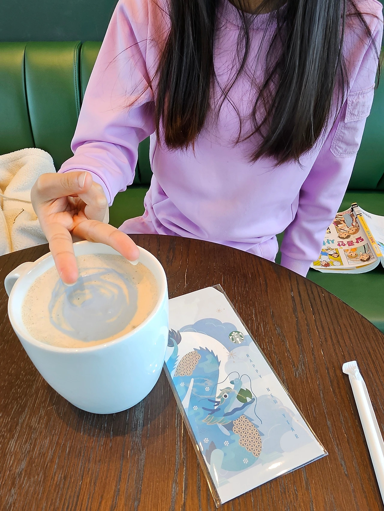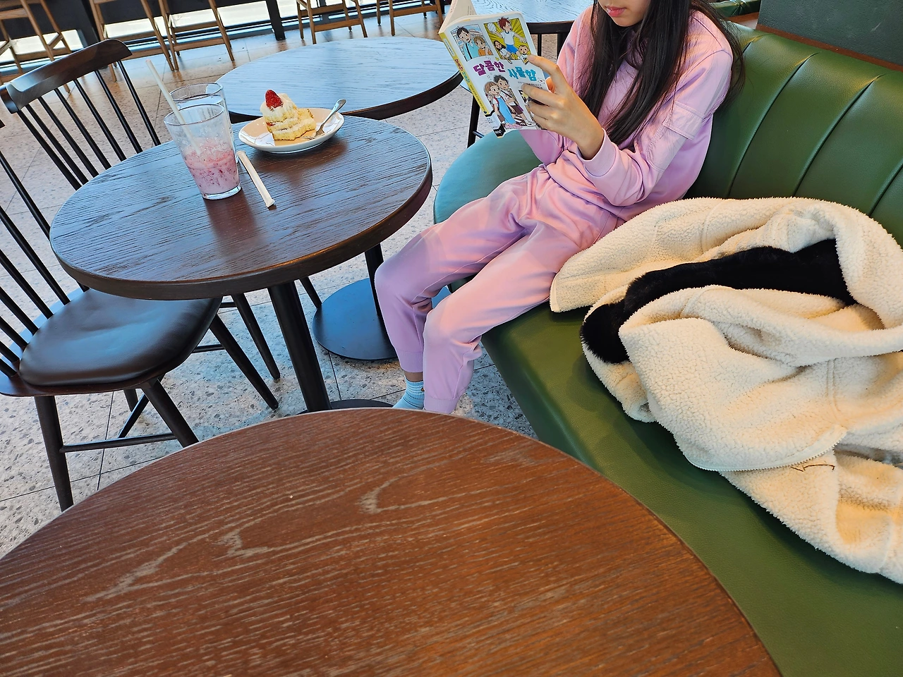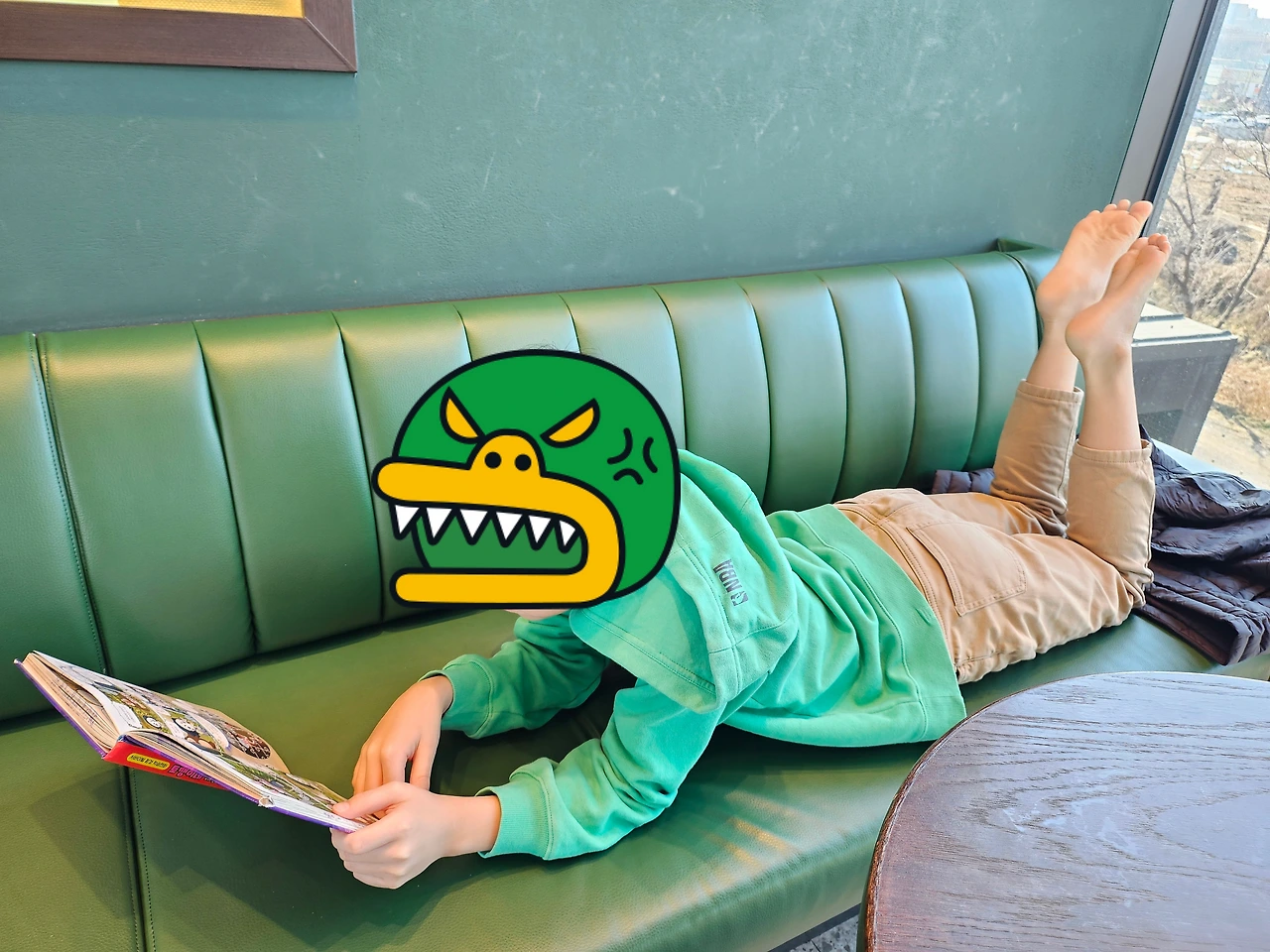 한참 엄마가 책을 열심히 읽고 빠져들만하면 체리가 이야기한다. "엄마 나 뭐 마시고 싶엉~" "엉? 또오???" 책 읽기에 관대해진 엄마는 또 카운터로 향해 <푸른 용 클래식 밀크티>를 그것도 제일 큰 사이즈로 주문하신다. '그래 니 맘대로 맘껏 누려라.' '지난번 예방주사 맞고 2000원이 비싼 딸기 시즌음료 세트를 안 사주고 버럭 했는데 아주 오늘 지갑을 터는구나! ' '엄마 쓸 때는 쓰는 사람이다. 그땐 너네가 밀크티와 초코라테를 매일 사오라 해서 엄마가 버럭 한 거고~ 나 그렇게 짠순이 아니다!'
