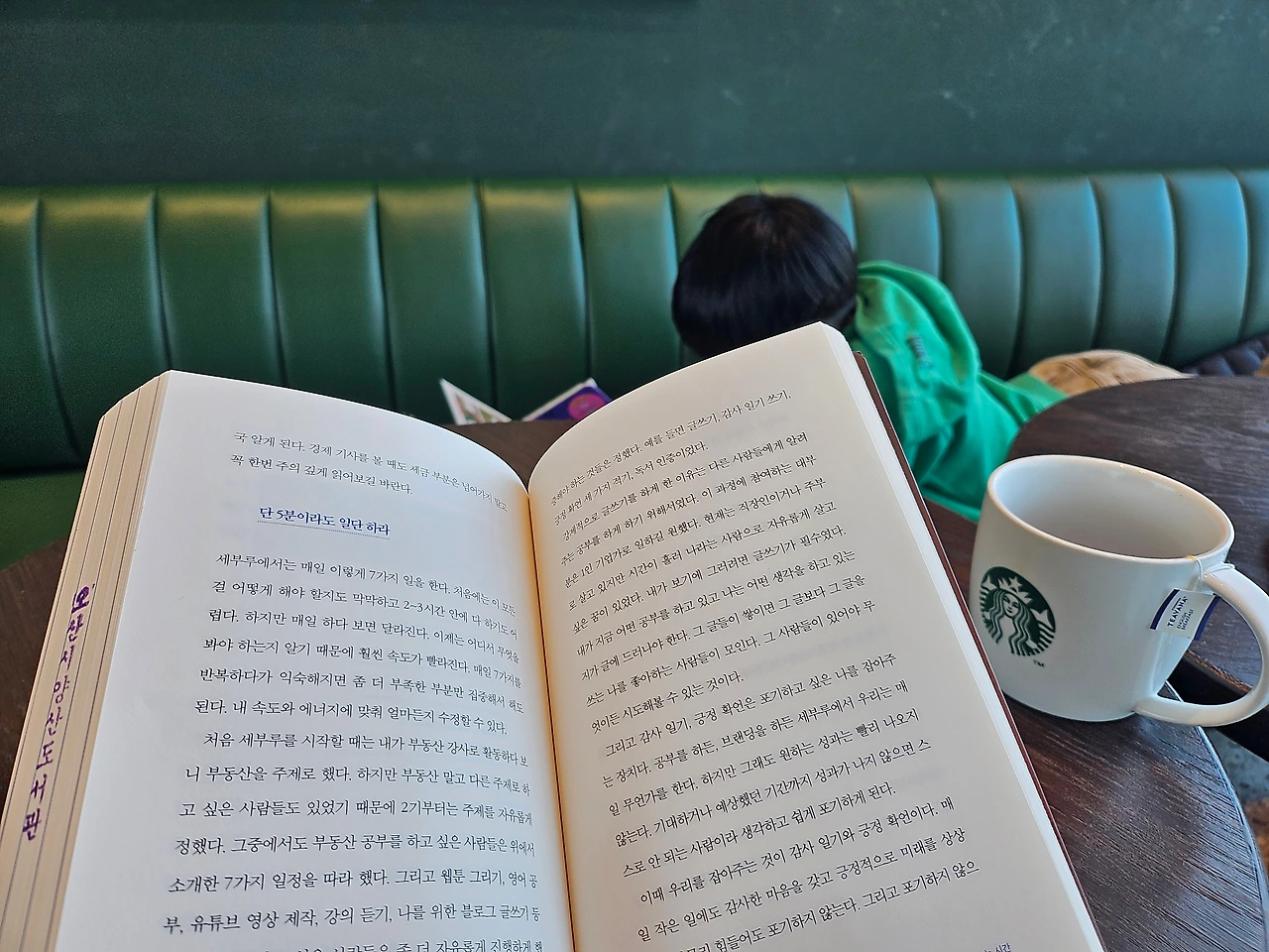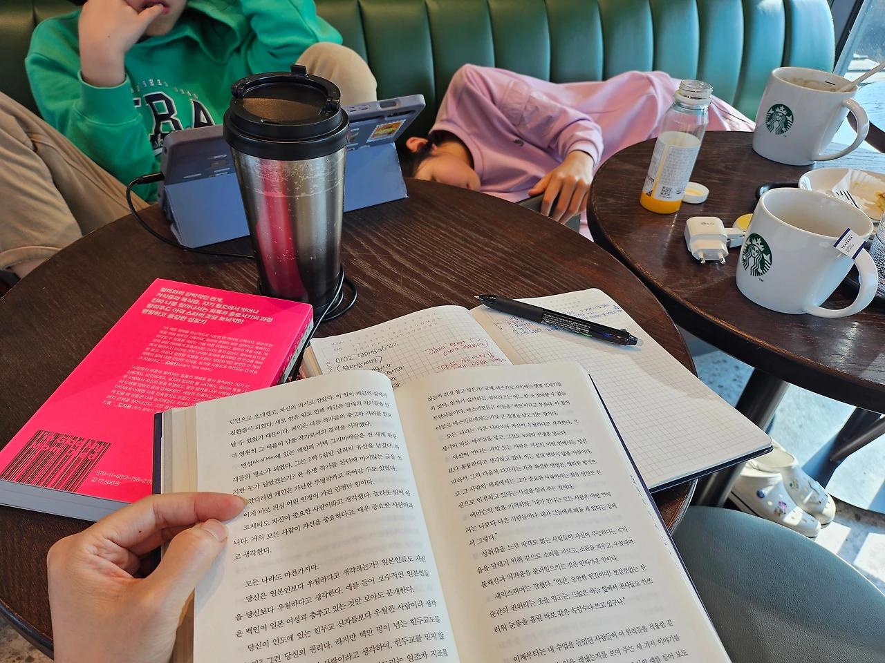 그렇게 간신히 자리를 추스려 엄마는 독서 삼매경, 아이들은 게임과 네이버웹툰에 빠져든다. 어느새 3시 30분. 시간이 후딱 지나간다. 이 자리에 더 머무고 싶지만 집에 가서 해야 할 일이 한가득이다. "가자, 엄마 할게 많어~" "가서 저녁준비해야 한다고! 빨리 가자!!!" 그래도 넓디넓은 스타벅스 덕분에 엄마의 콧바람을 쏘이고 추가 주차비 결제를 하며 집으로 향한다. "그래, 담달에 한번 더 오자" '엄마에겐 아직 스타벅스 쿠폰이 남아있다.'